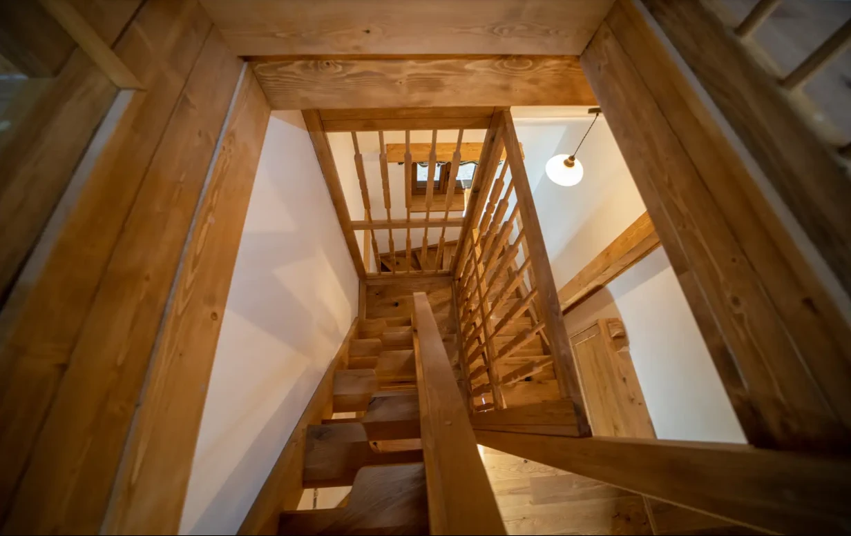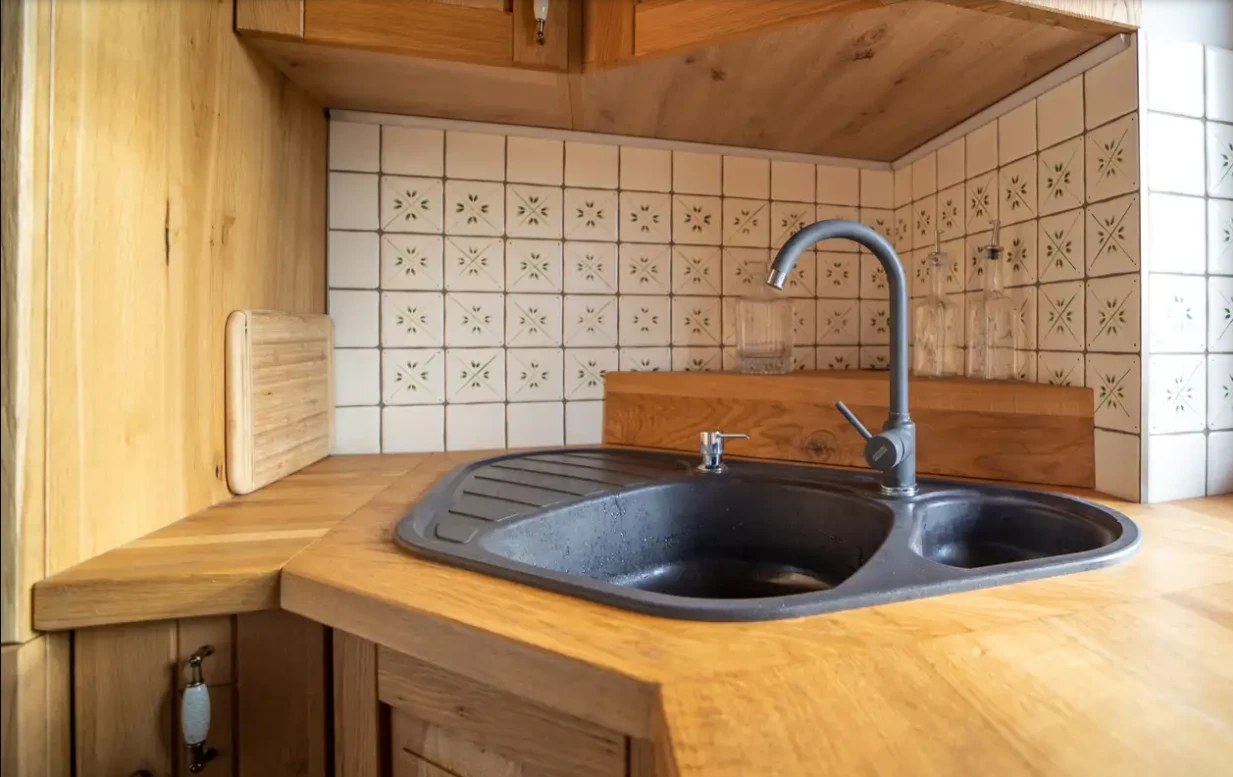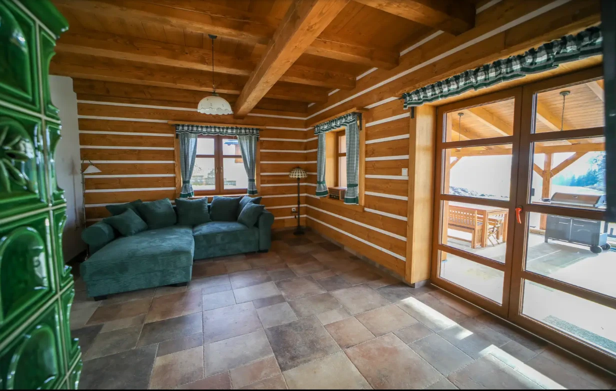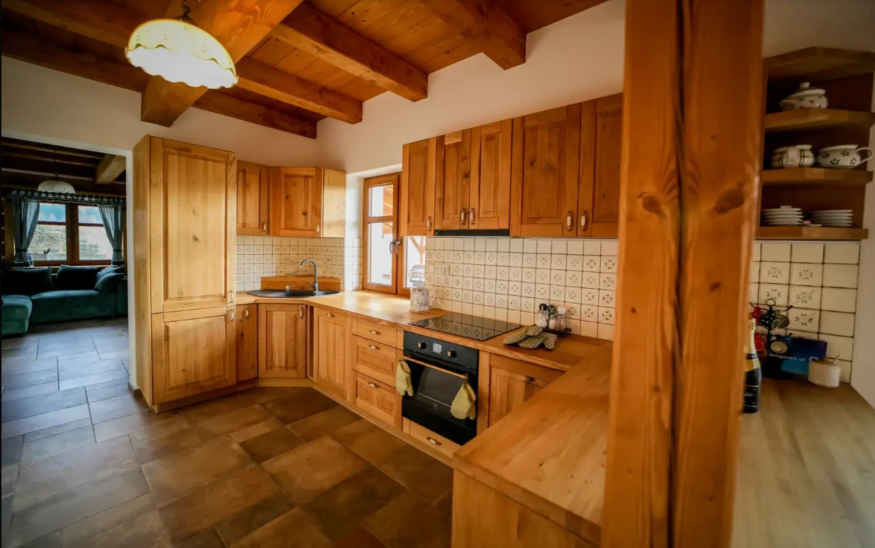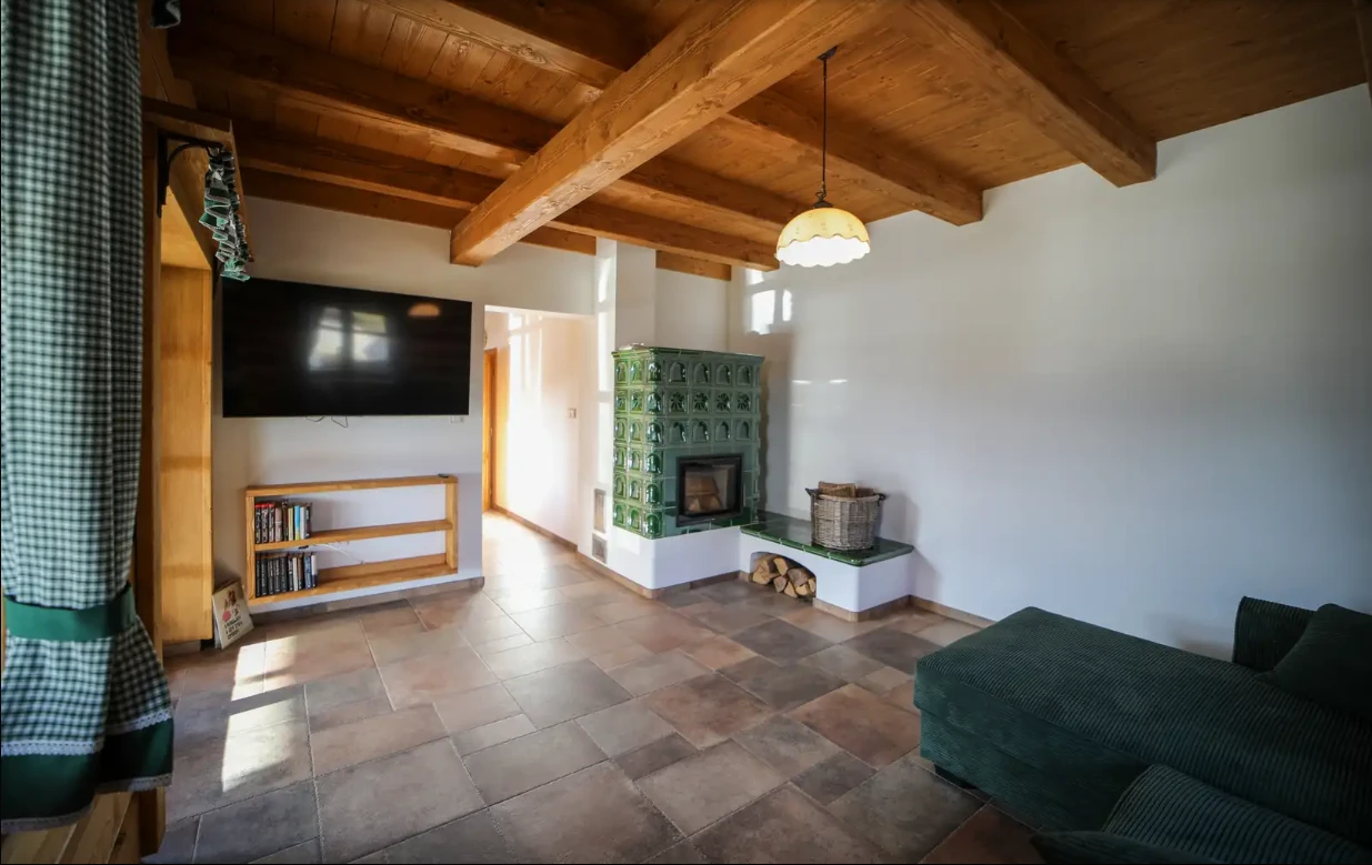 Prostorný obývací pokoj je vybaven kachlovými kamny, pohovkou a televizí. Plně vybavená kuchyň zahrnuje indukční varnou desku, elektrickou troubu, mikrovlnnou troubu, lednici s mrazákem a myčku nádobí.