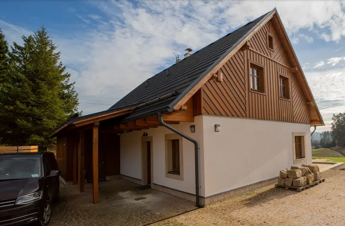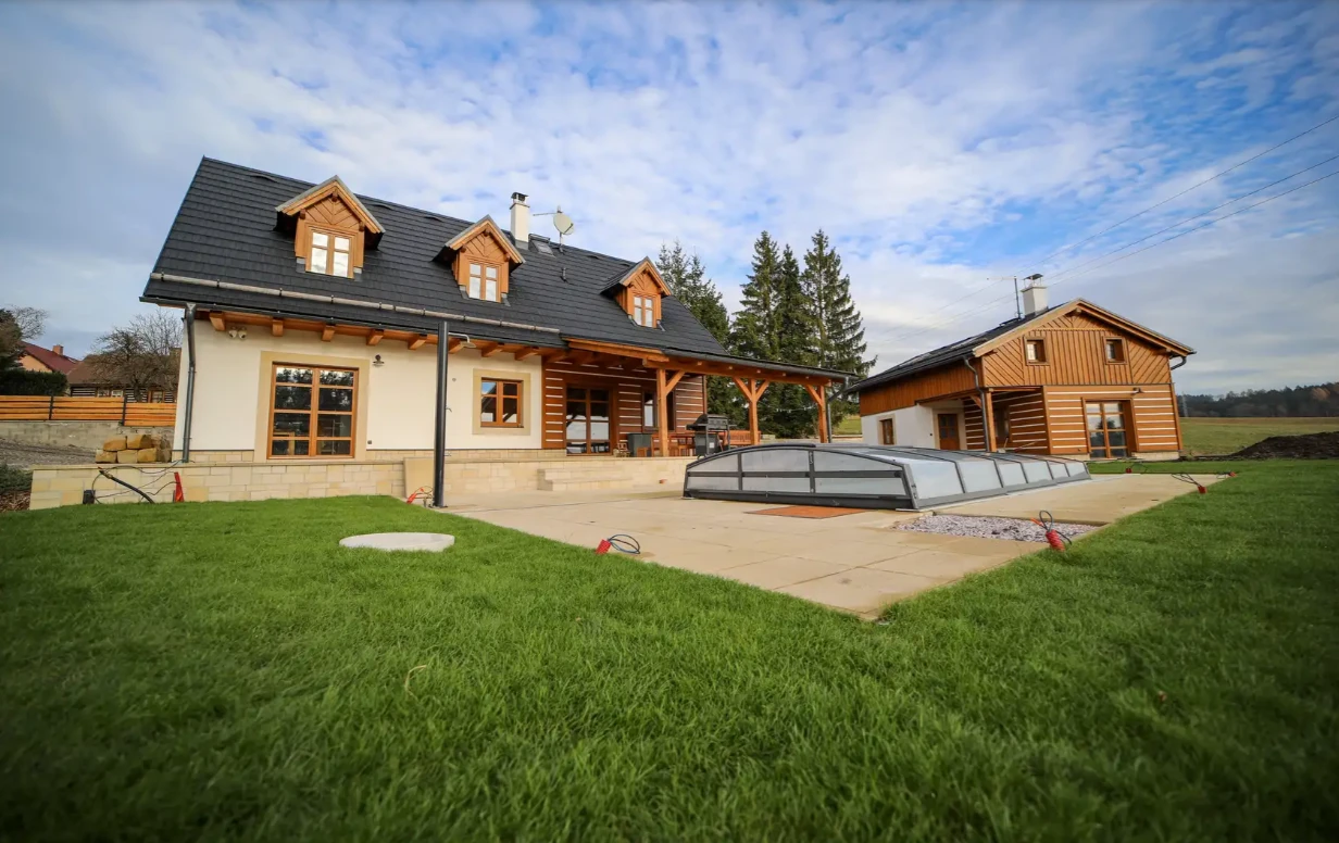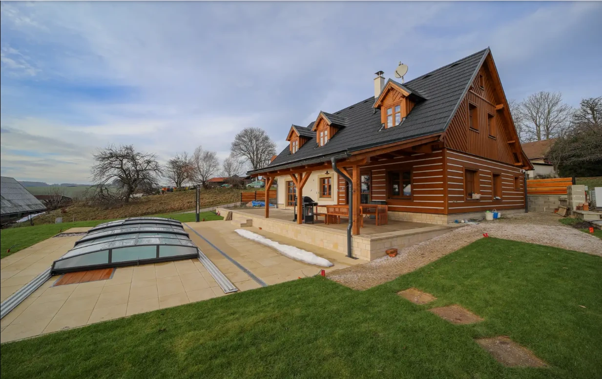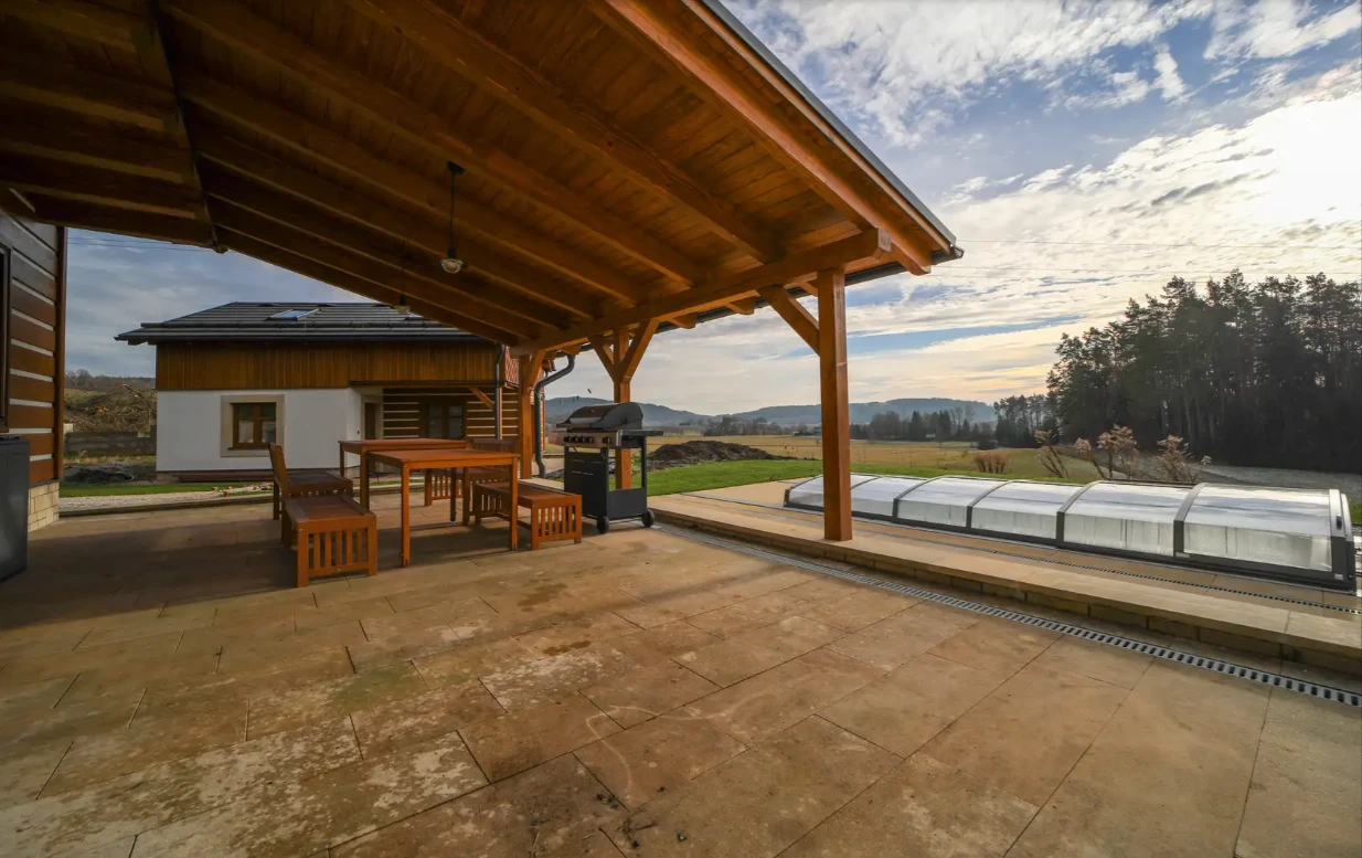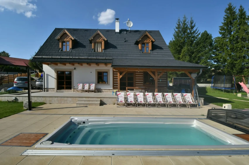 Venkovní prostory nabízejí vyhřívaný bazén s protiproudem (v provozu od dubna do září), terasu s posezením a grilem a dětské hřiště s houpačkou, skluzavkou a trampolínou. Parkování je zajištěno na oploceném pozemku přímo u chalupy.