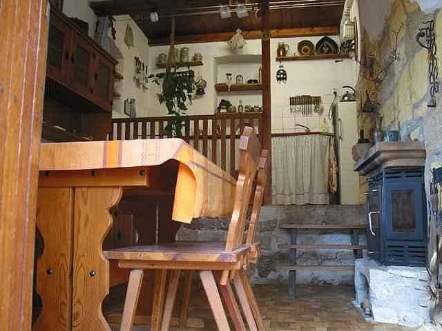 V přízemním domku je stylově ve dřevě zařízená jídelna s krbem a plně vybaveným kuchyňským koutem (chladnička, kombinovaný el. sporák s troubou, kuchyňská linka s dřezem a studenou a teplou vodou, varná konvice, nádobí. Pro vlastní vaření je možnost nákupu širokého sortimentu potravin a polotovarů v místní samoobsluze na návsi.