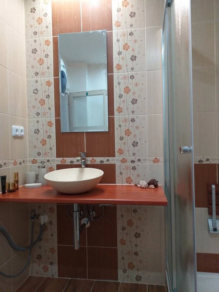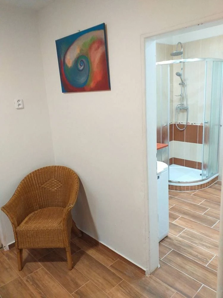 Chaloupka má koupelnu s WC, umývadlem a sprchovým koutem.