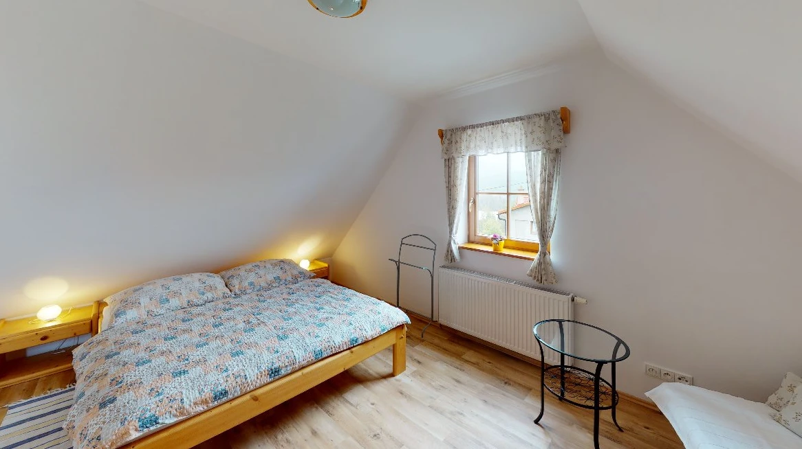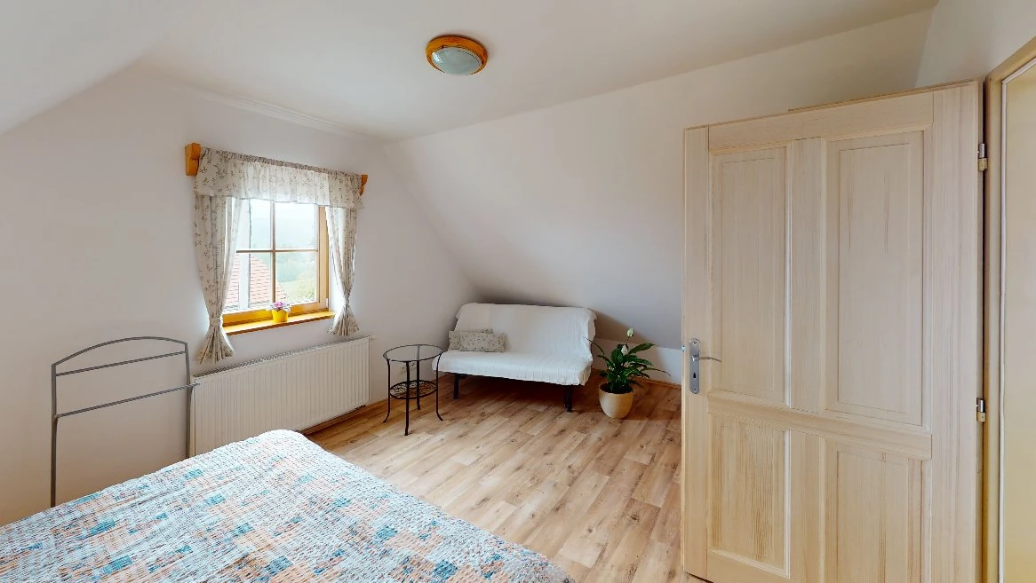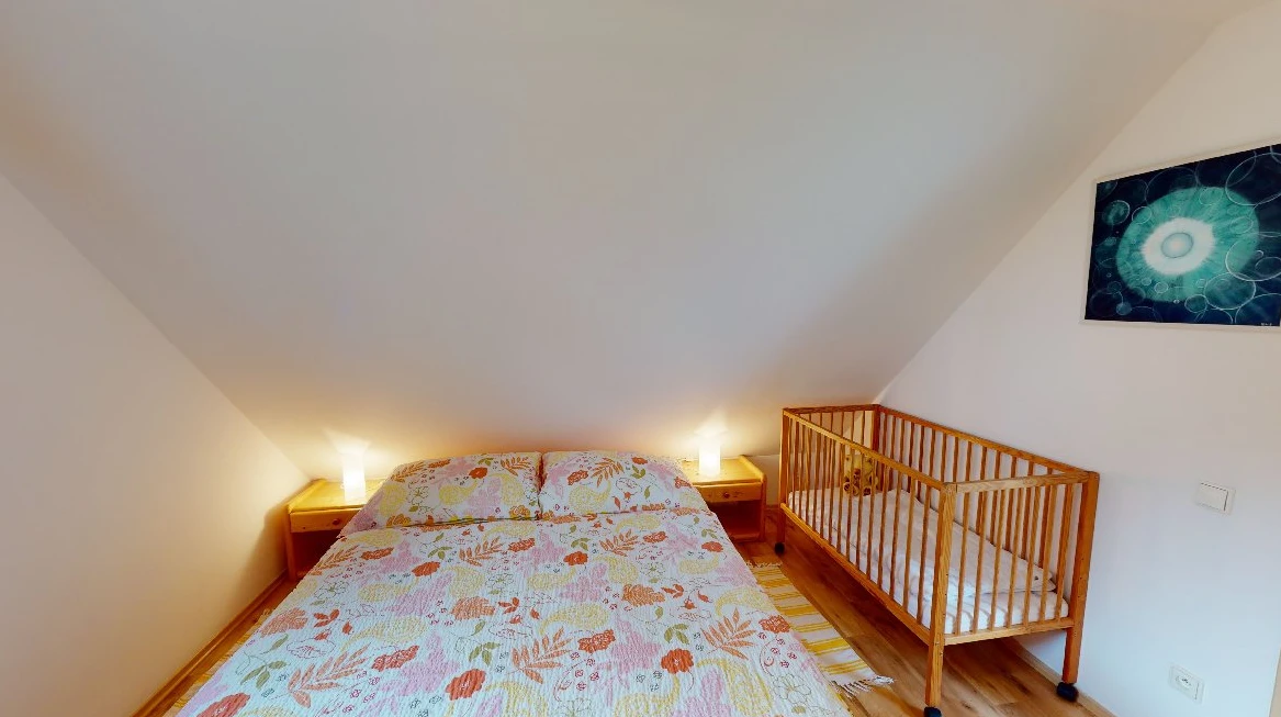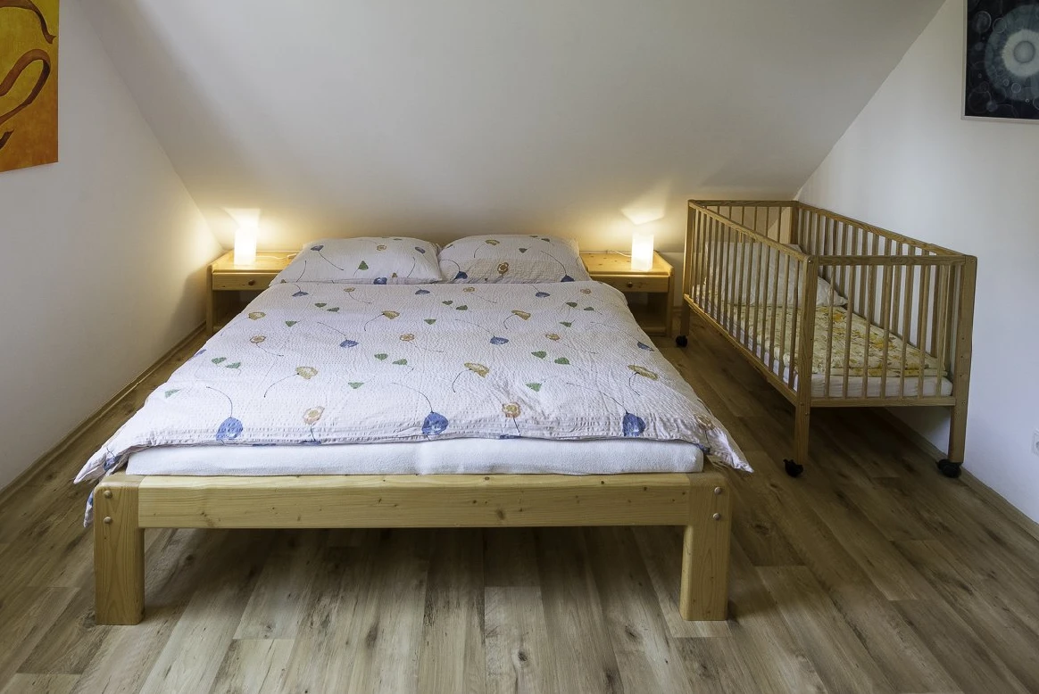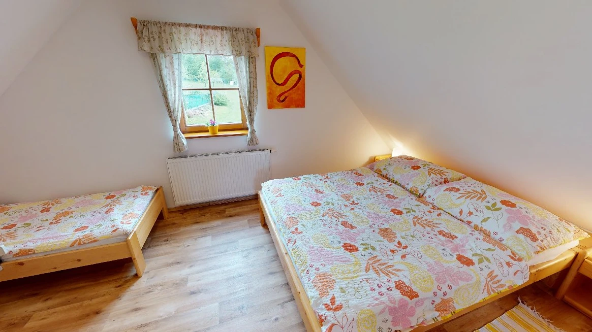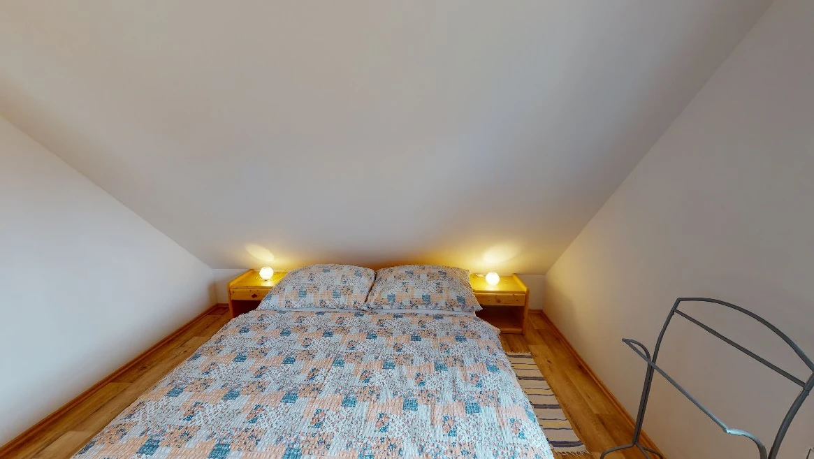 V podkroví jsou dvě samostatné ložnice. První ložnice je vybavena manželskou postelí, dvěma jednolůžkovými postelemi a dětskou postýlkou. Druhá ložnice má manželskou postel a rozkládací pohovku. V podkroví je rovněž samostatná toaleta s umyvadlem.