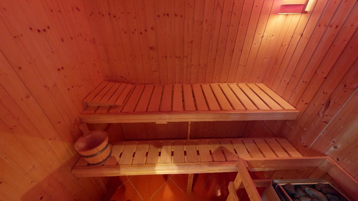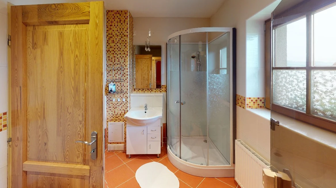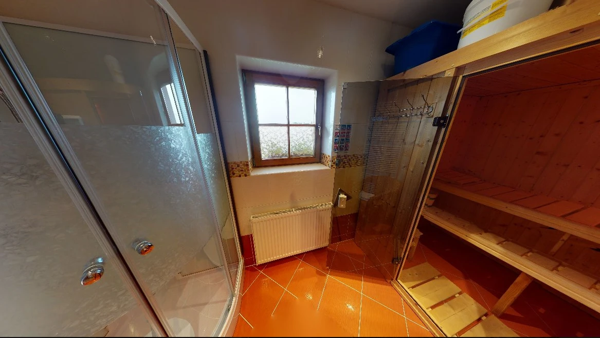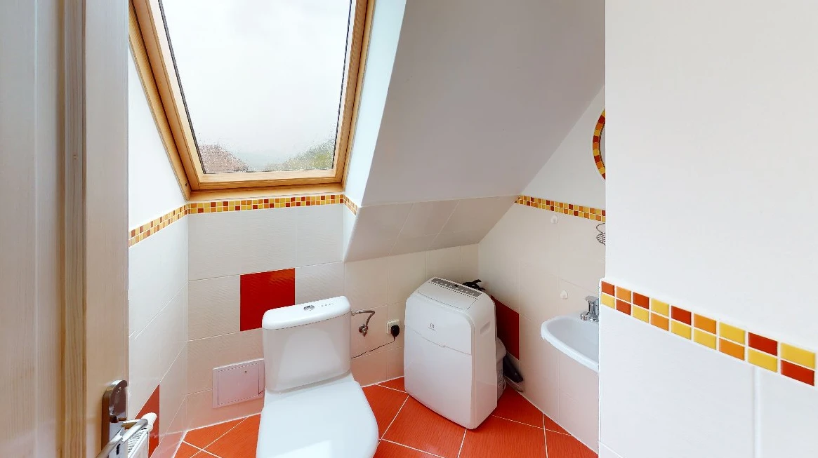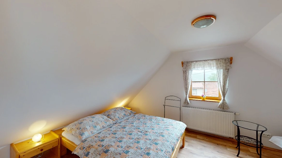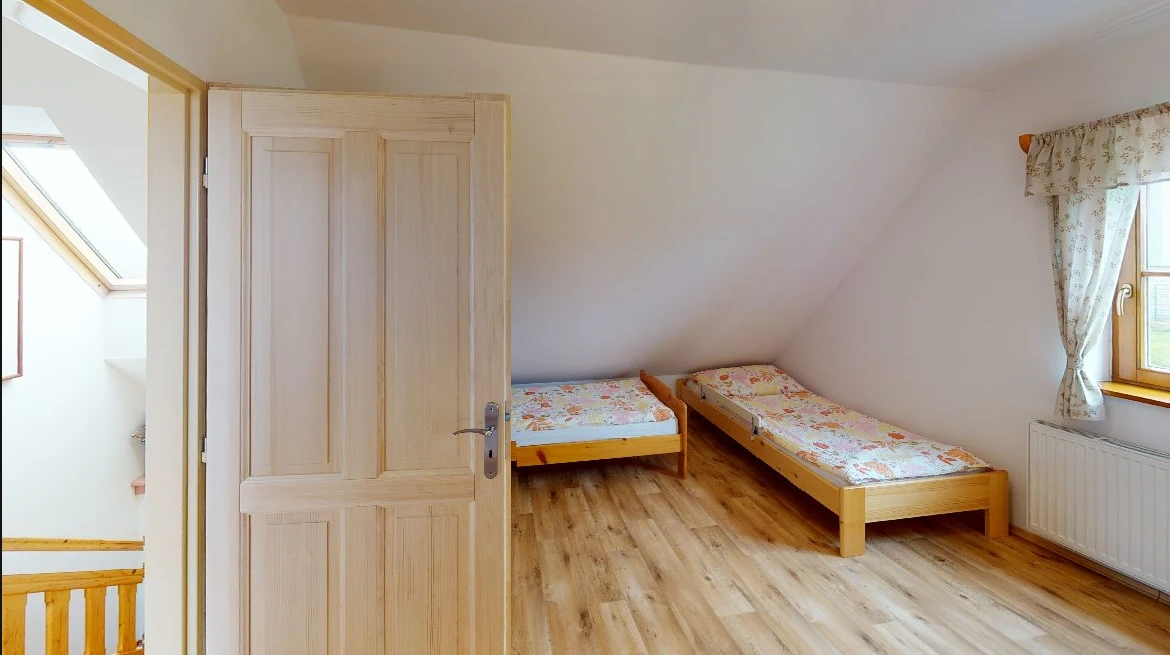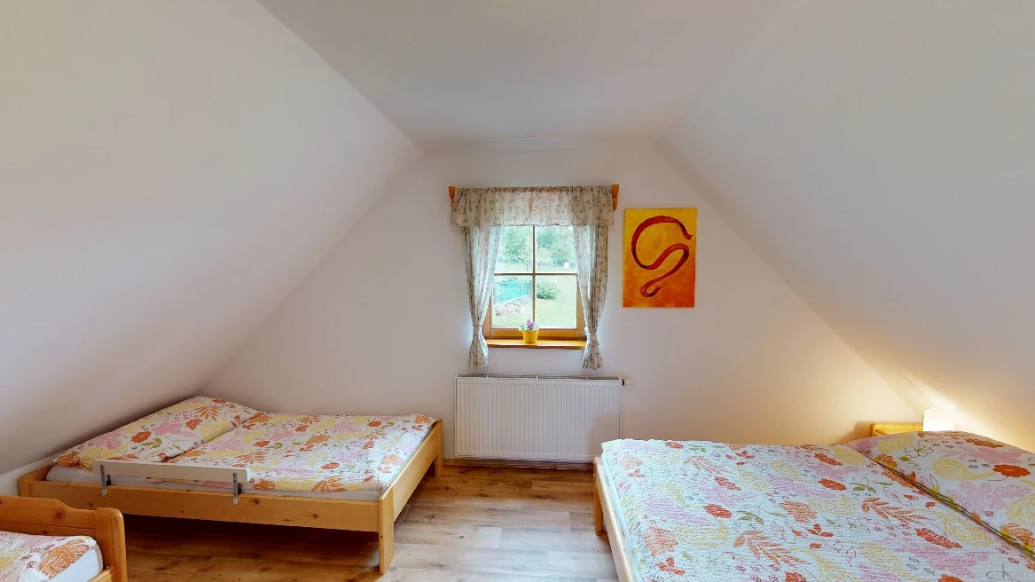 V podkroví jsou dvě samostatné ložnice. První ložnice je vybavena manželskou postelí, dvěma jednolůžkovými postelemi a dětskou postýlkou. Druhá ložnice má manželskou postel a rozkládací pohovku. V podkroví je rovněž samostatná toaleta s umyvadlem.