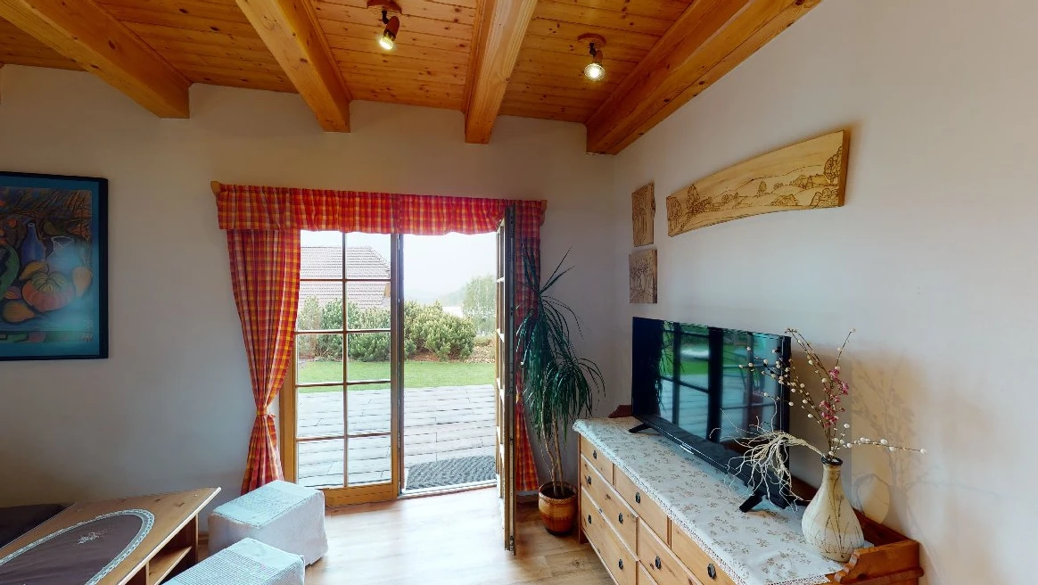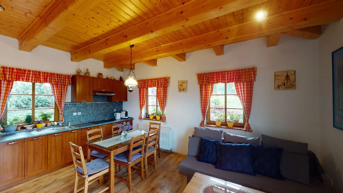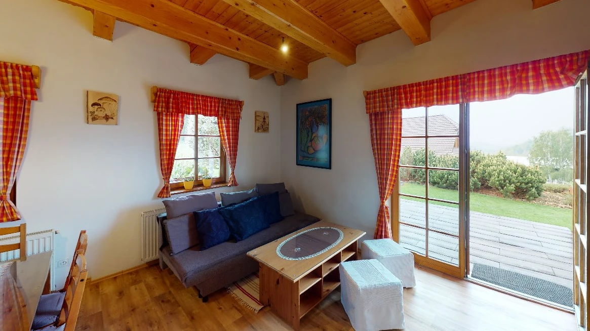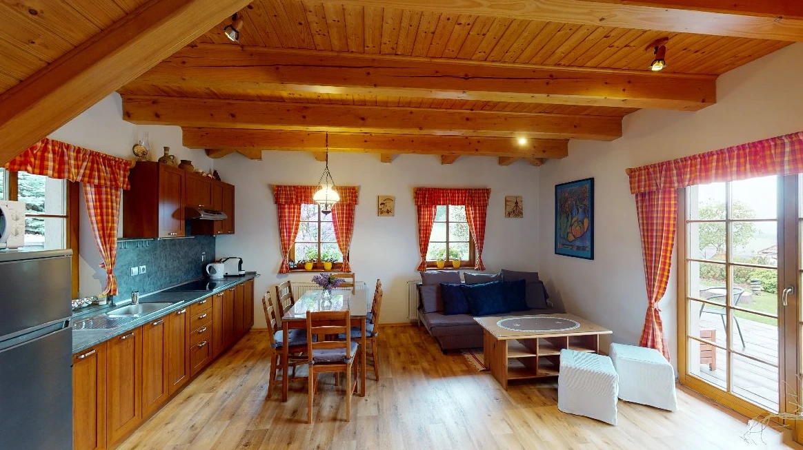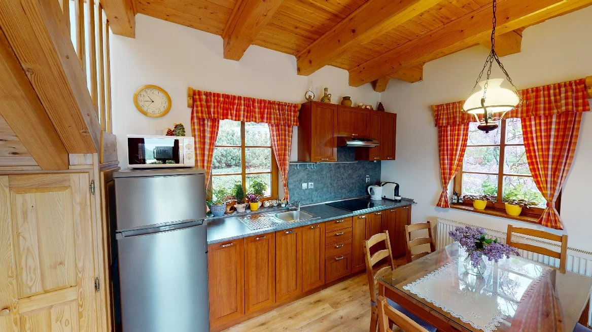 V přízemí chalupy se nachází obývací pokoj s rozkládací pohovkou, televizí se satelitním příjmem a DVD přehrávačem, jídelní stůl a plně vybavený kuchyňský kout (keramická varná deska, lednice s mrazákem, mikrovlnná trouba, rychlovarná konvice, kapslový kávovar). Součástí přízemí je koupelna s podlahovým vytápěním, sprchovým koutem a finskou saunou, samostatná toaleta a dětská vanička.