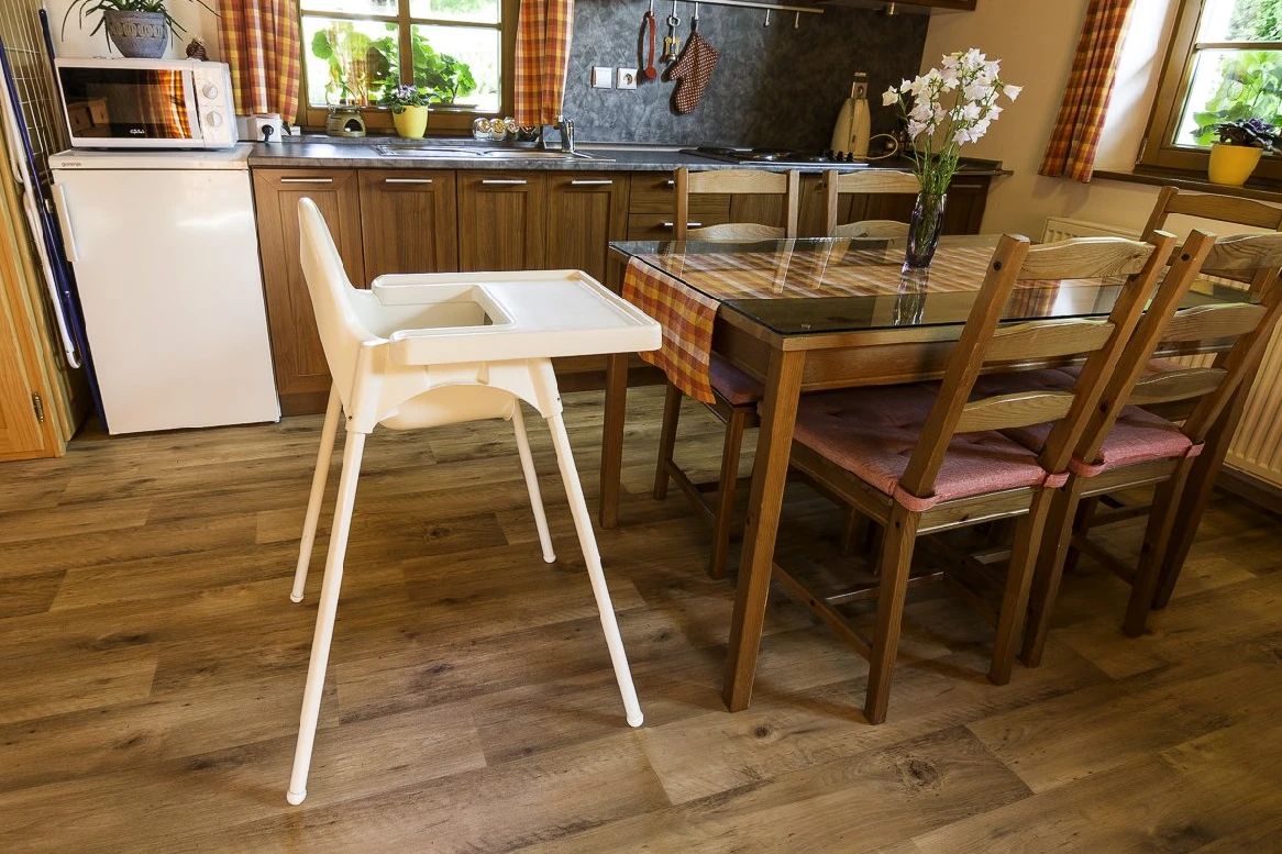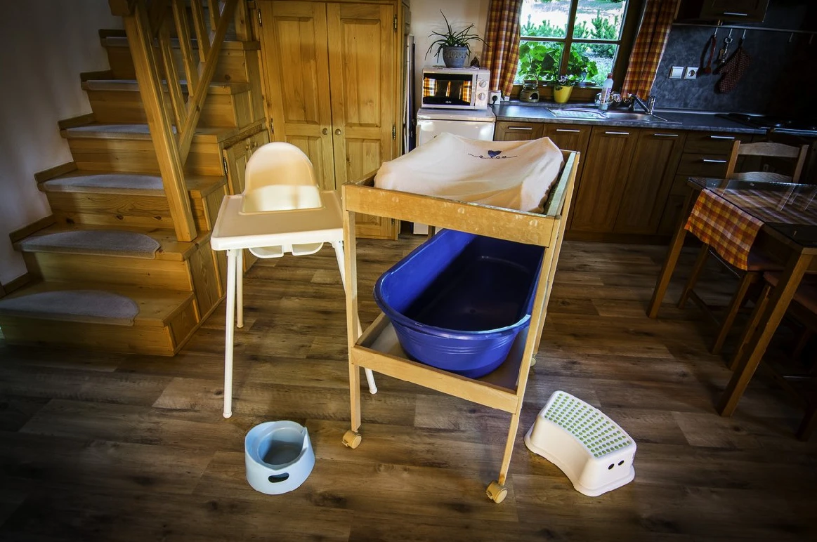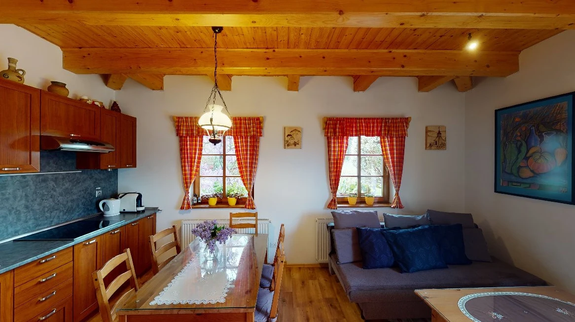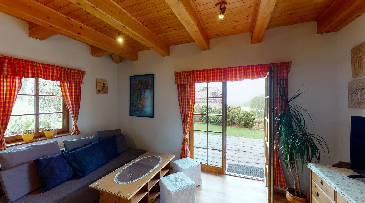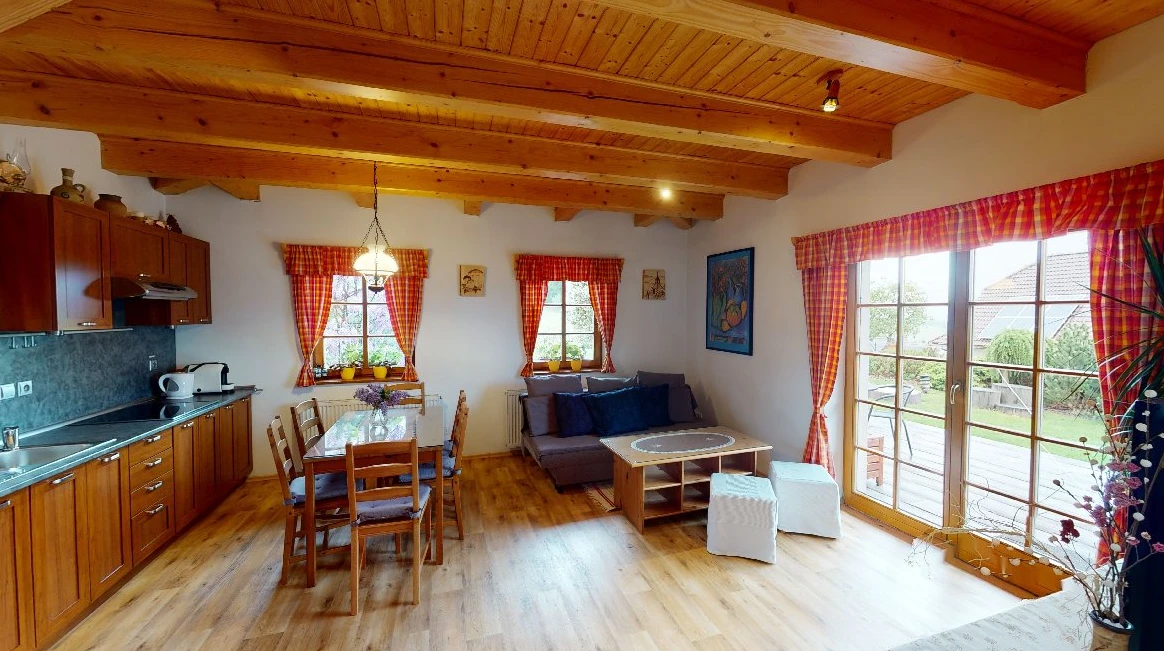 V přízemí chalupy se nachází obývací pokoj s rozkládací pohovkou, televizí se satelitním příjmem a DVD přehrávačem, jídelní stůl a plně vybavený kuchyňský kout (keramická varná deska, lednice s mrazákem, mikrovlnná trouba, rychlovarná konvice, kapslový kávovar). Součástí přízemí je koupelna s podlahovým vytápěním, sprchovým koutem a finskou saunou, samostatná toaleta a dětská vanička.