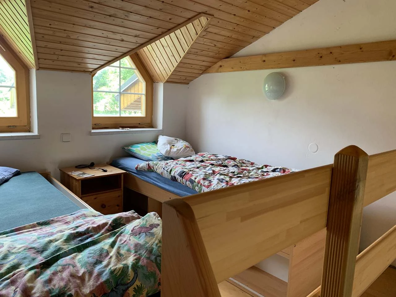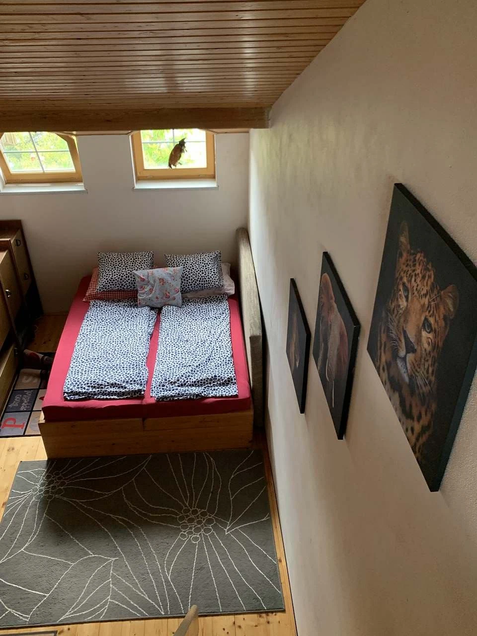 Ložnice – v druhé místnosti je manželská postel a šatní skříň. V patře jsou další dvě lůžka, která se mohou v případě potřeby libovolně srazit. Patro lze také částečně uzavřít od okolního prostoru rohožemi na stropě. Nejdříve spusťte prostřední a pak boční. Dejte pozor na zamotání šňůrek! Další dvě přistýlky Vám ukážeme při předávání.