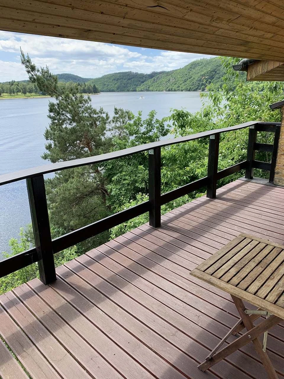 Sluneční terasa – unikátem chalupy je prostorná sluneční terasa, na které si připadáte skutečně jako na vodě. Můžete si na ni vzít lehátka, stůl, občerstvení či oběd nebo víno. V parných dnech, když na terasu paří slunce, si můžete vzít sluneční plachtu, kterou pomocí karabin upevníte na oka, která naleznete pod okapem. Na terase pak můžete sedět ve stínu. Dbejte opatrnosti při naklánění přes zábradlí. Neopírejte se vší silou!