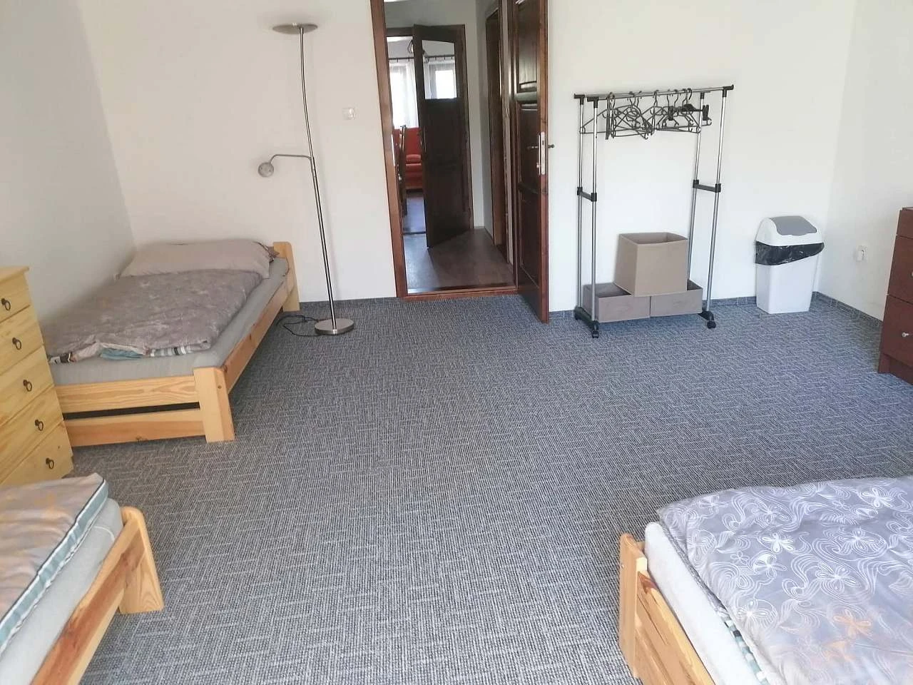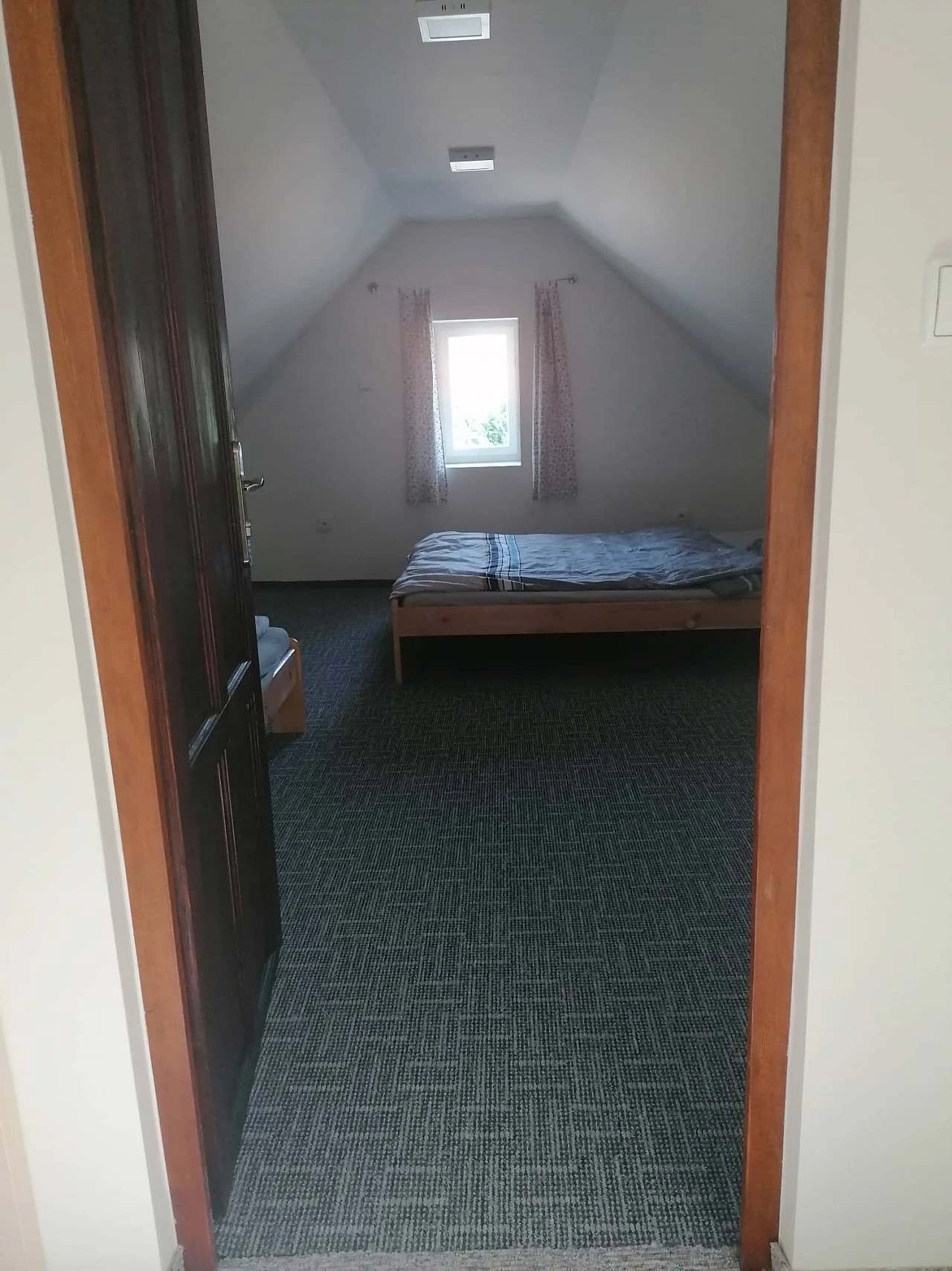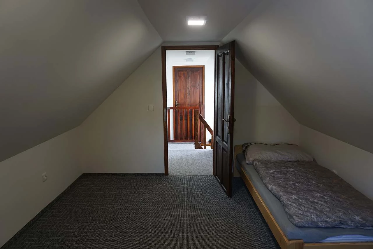V přízemí 1x čtyřlůžkový pokoj, chodba, společenská místnost (kuchyň), koupelna s toaletou, další toaleta za chodbou.