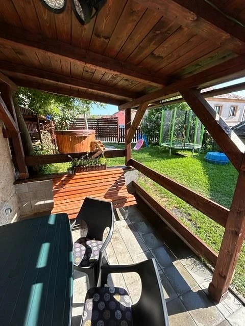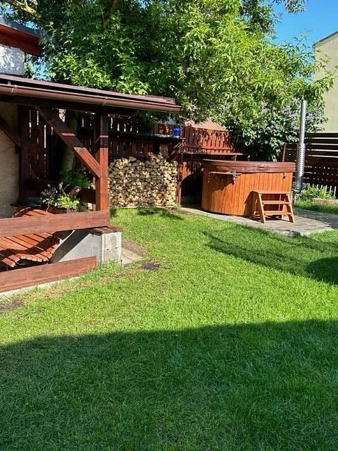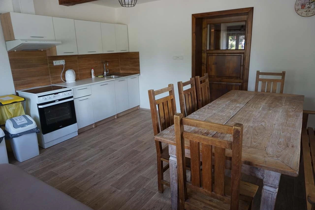 Kompletně vybavená kuchyň, vnitřní posezení+gauč, TV, internet, venkovní posezení, gril, trampolína, pískoviště, koupací masážní sud od 1.6.2023.