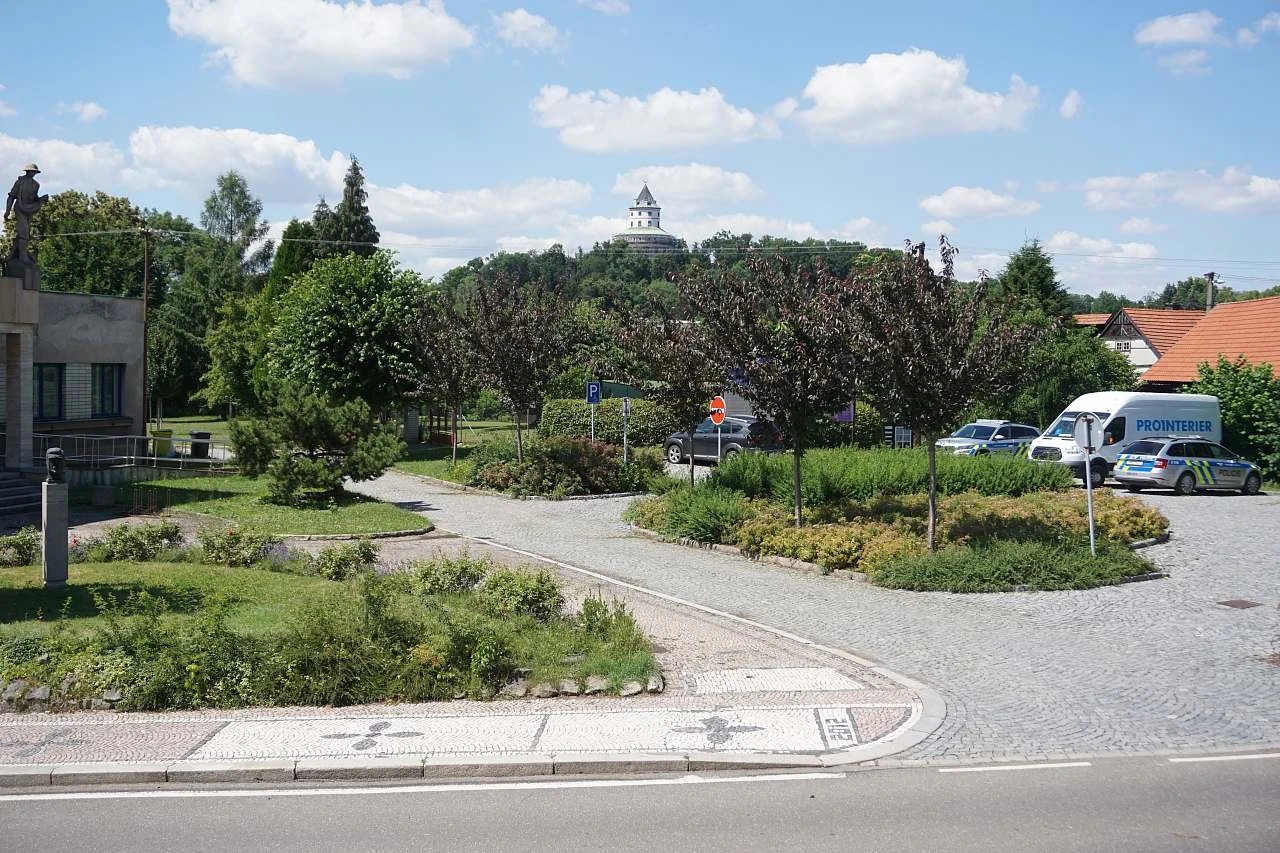 Parkoviště za chalupou (zadními vrátky), nebo přes ulici u obecního úřadu.