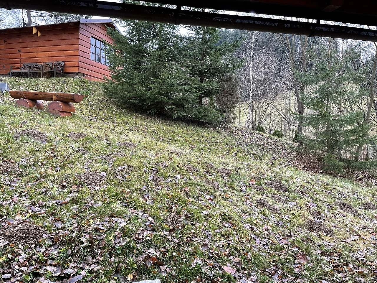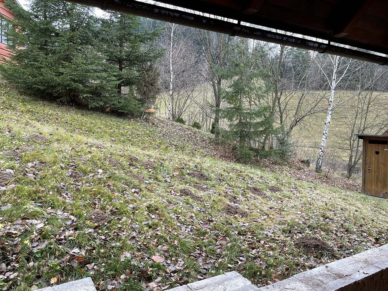 Venku je kryté posezení, ohniště, gril na dřevěné uhlí, dětské hřiště s pískovištěm, houpačkou, tabulí a dalšími hračkami.