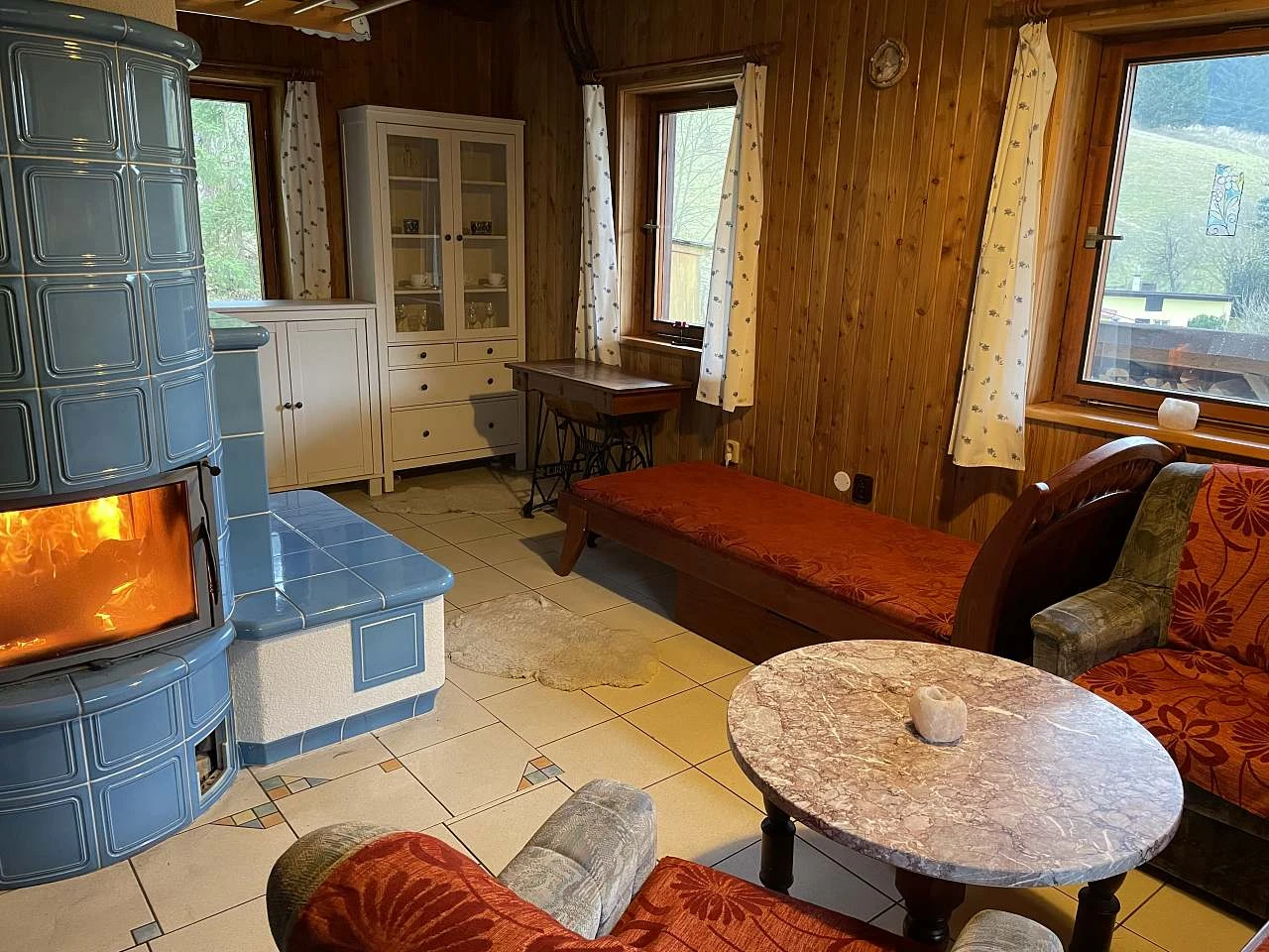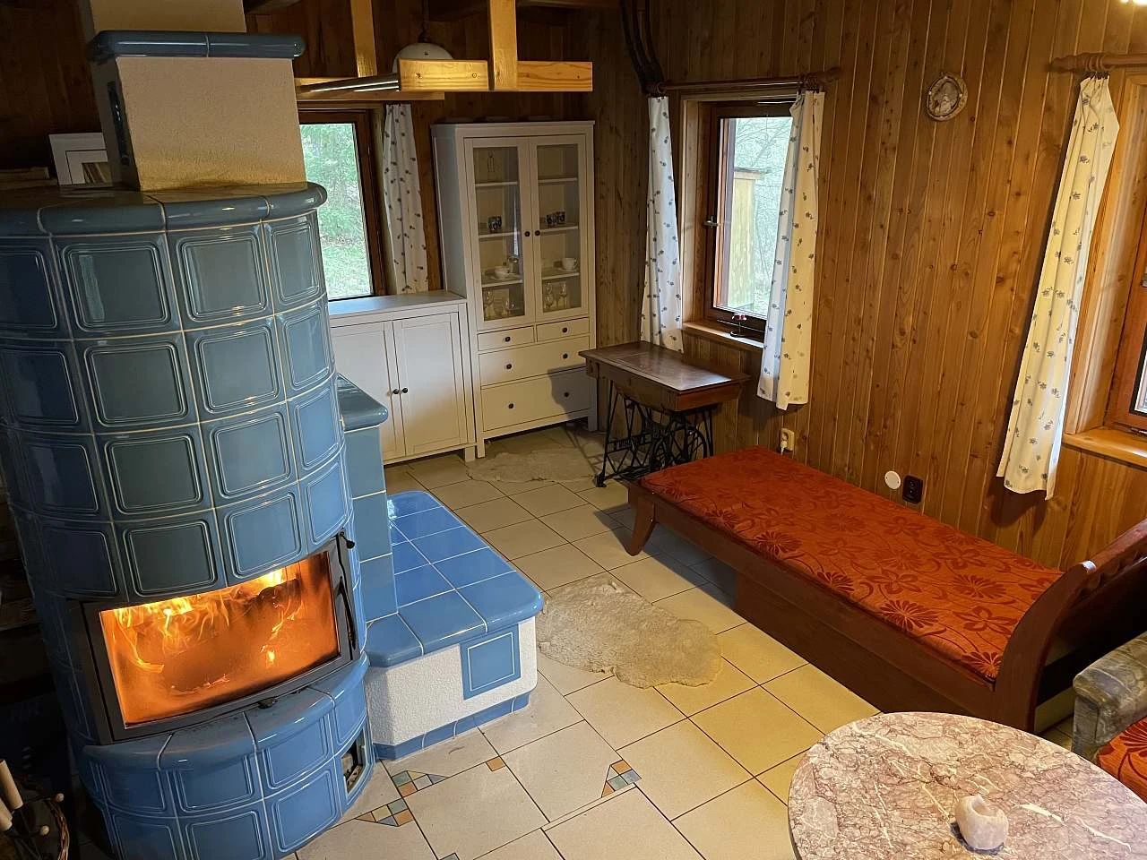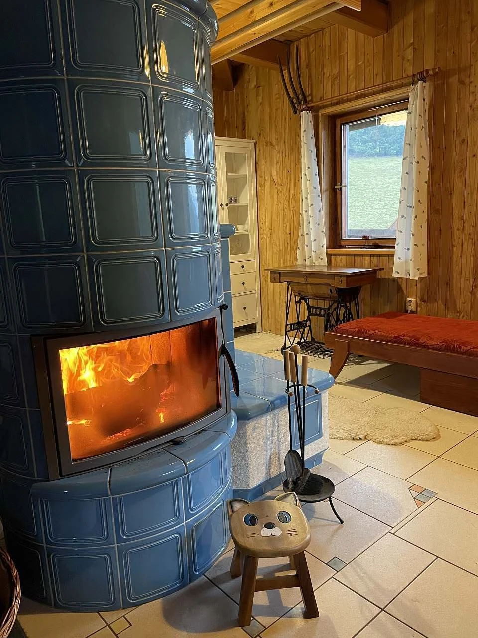 Vytápění je zajištěno moderními kachlovými kamny a v koupelně podlahovým vytápěním.