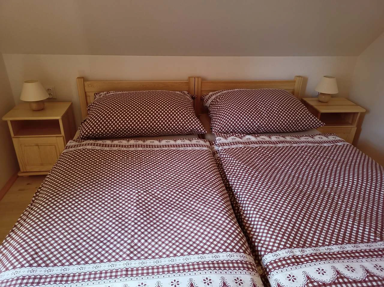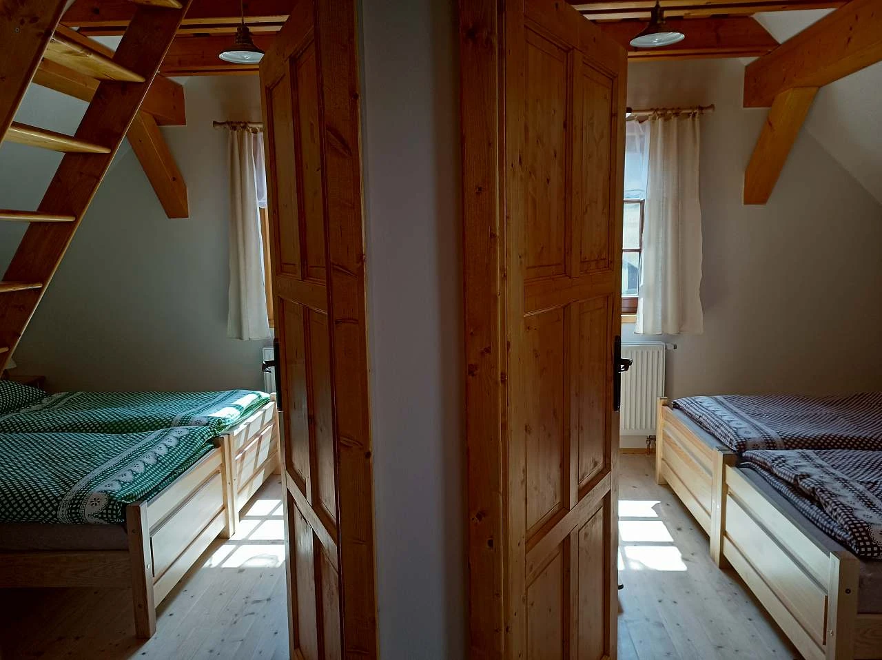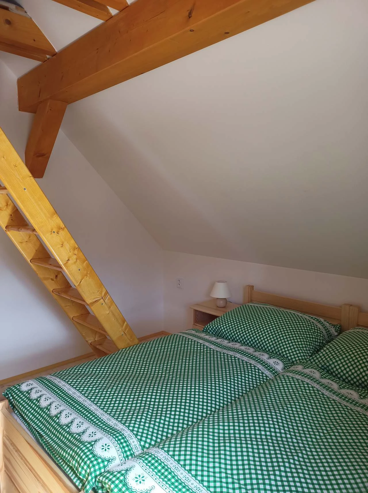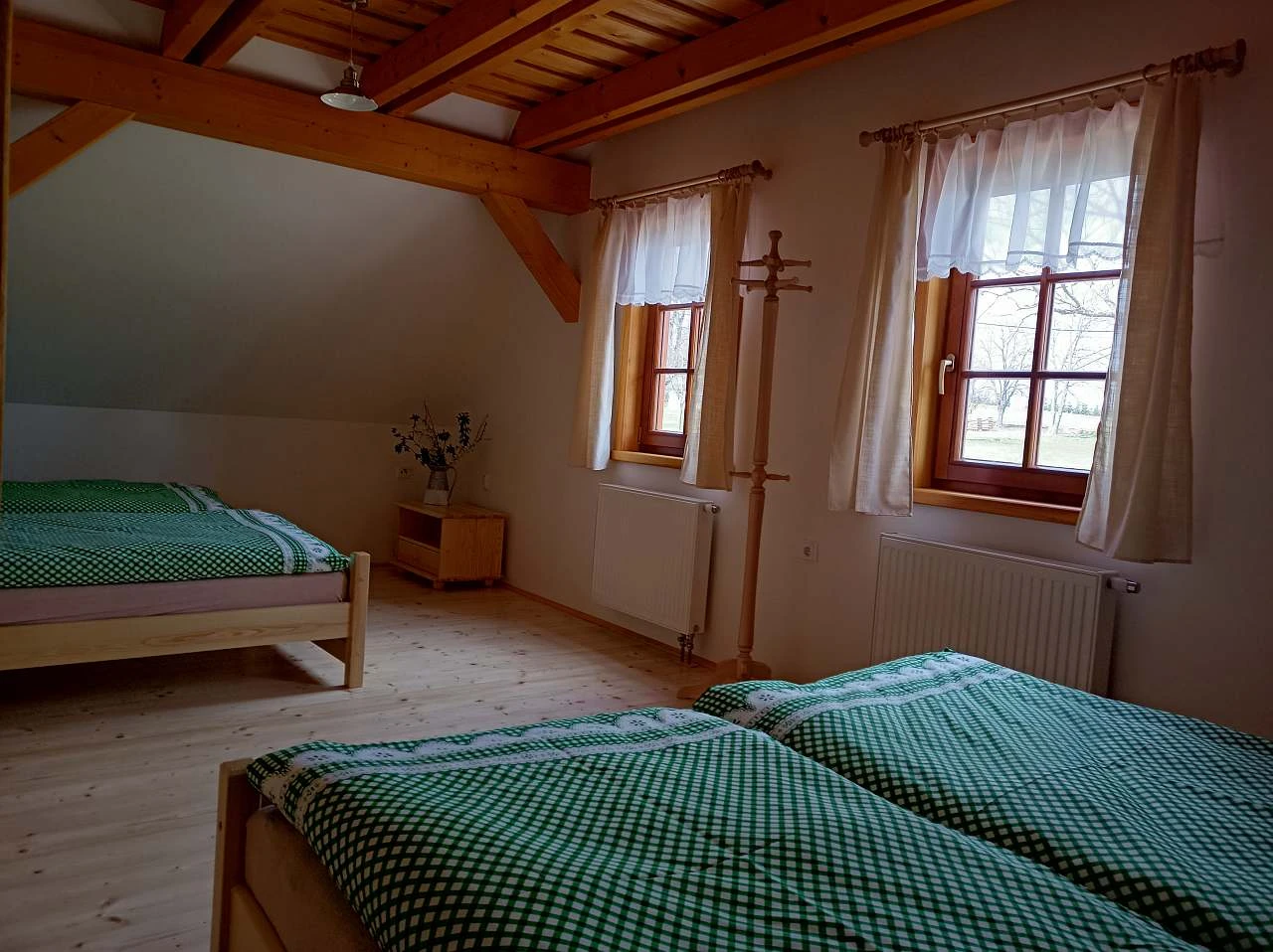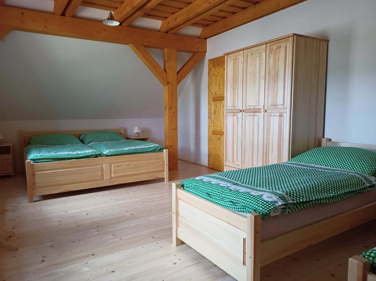 Ložnice, manželské postele, samostatná lůžka, společenská místnost, TV, satelit, pohovka, rádio, jídelní posezení, kachlová kamna, fotbálek, myčka, lednice, mrazák, mikrovlnná trouba, indukční deska, elektrická trouba, varná konvice, dětská postýlka, koupací vanička, dětská židlička.