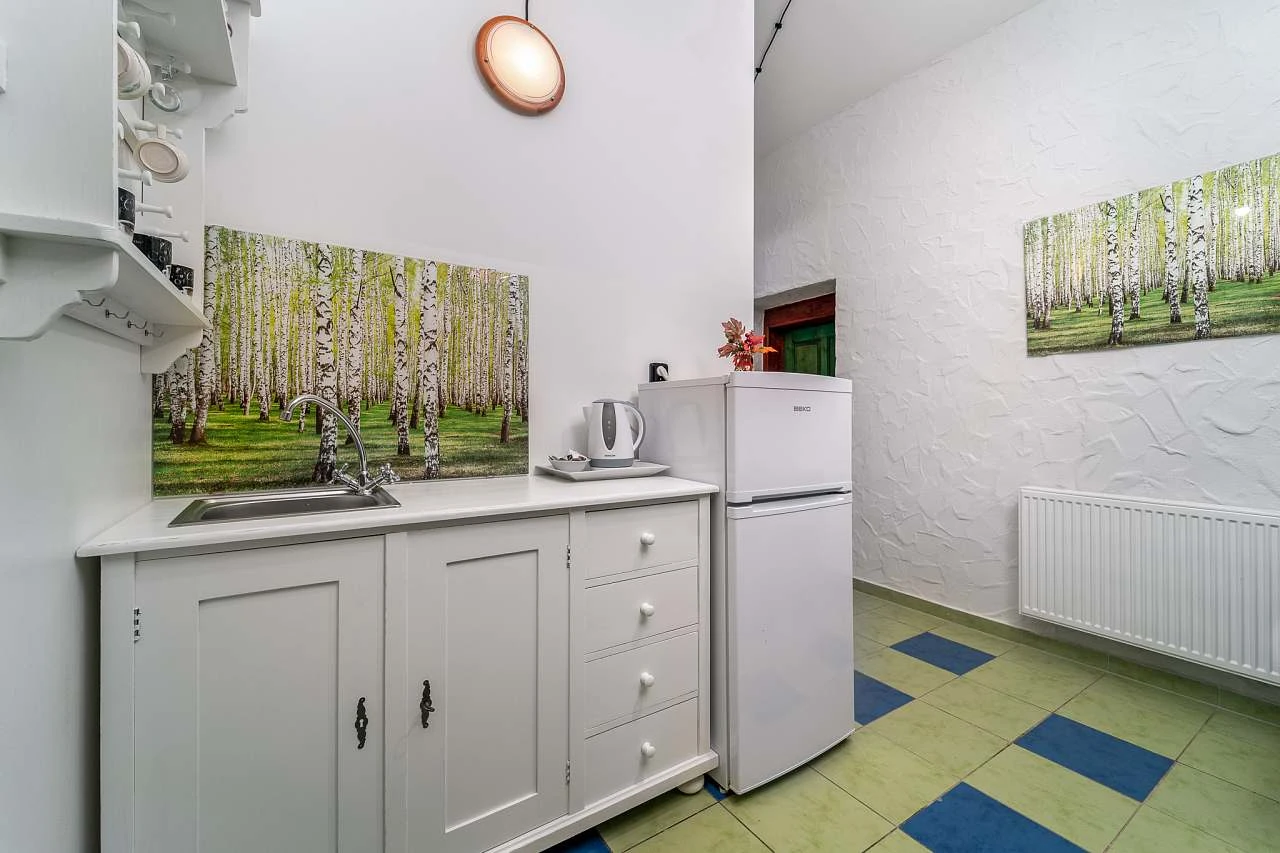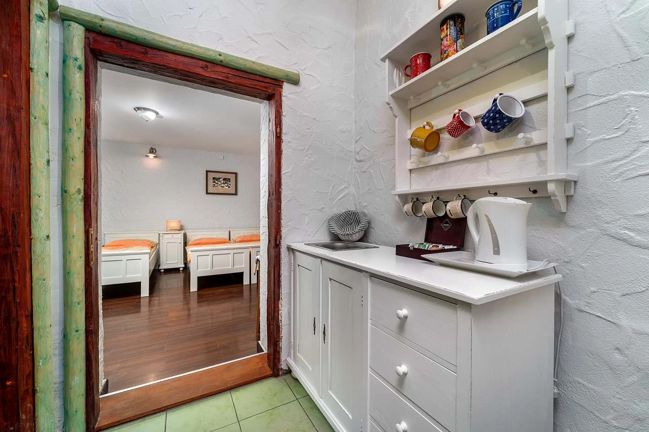 Chalupa disponuje plně vybavenou kuchyní: elektrický sporák, konvektomat, myčka nádobí, kávovar na kapsle NESPRESSO, potřebné vybavení pro stolování a přípravu jídel, lednice s mrazničkou, samostatný mrazicí box, nápojová lednice.