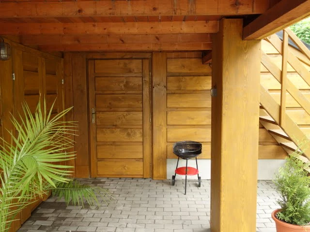 Autem, autobusem. Parkování přímo u chalupy za plotem s branou.