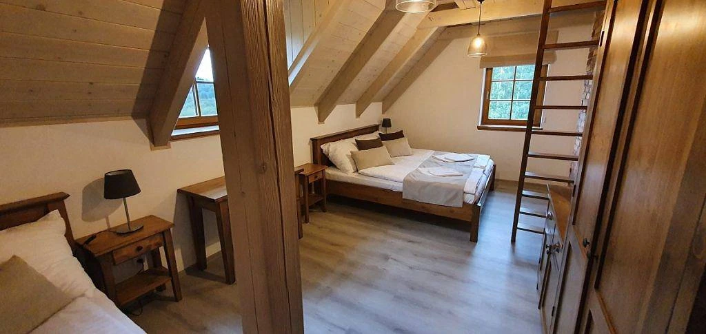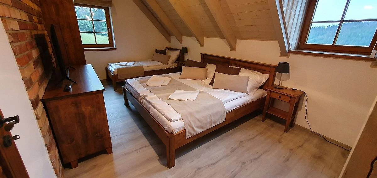 Chalupa k pronájmu poskytuje ubytování pro 17 osob ve 4 ložnicích.