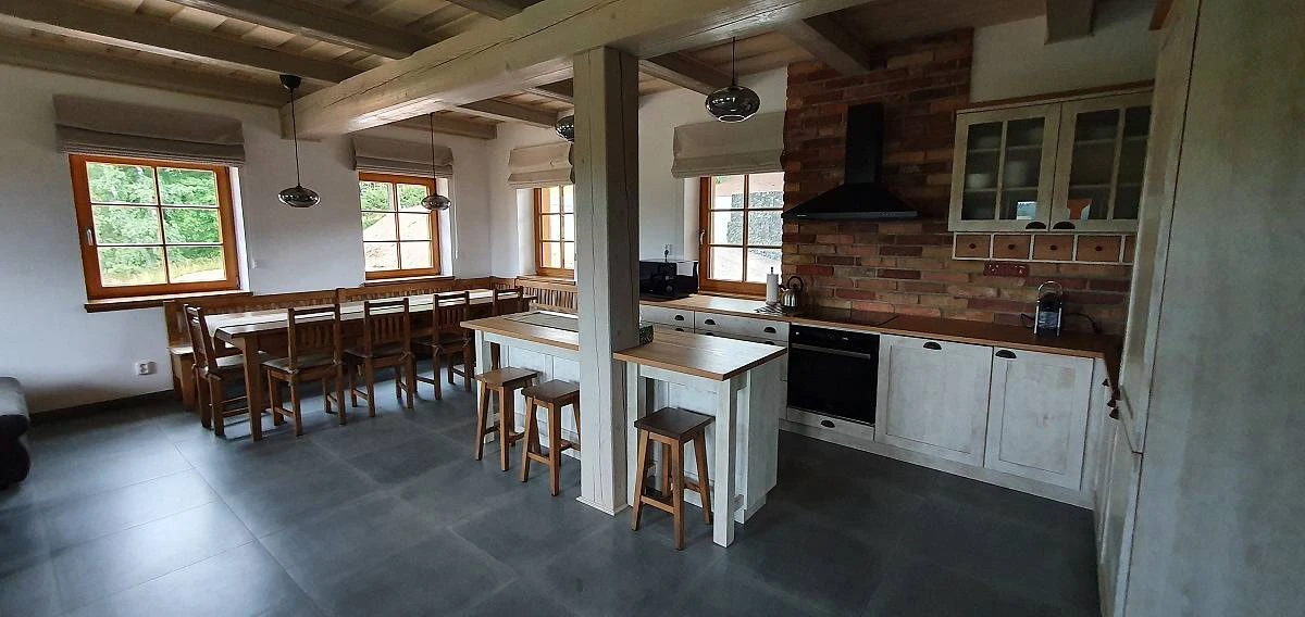 Kuchyň je vybavená lednicí s mrazákem, indukční deskou, sporákem, mikrovlnou trouba, topinkovačem, toustovačem, nespressem. V kuchyni, která je společná s obývacím pokojem jsou krbová kamna a televize.