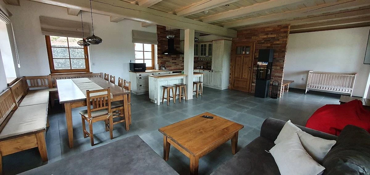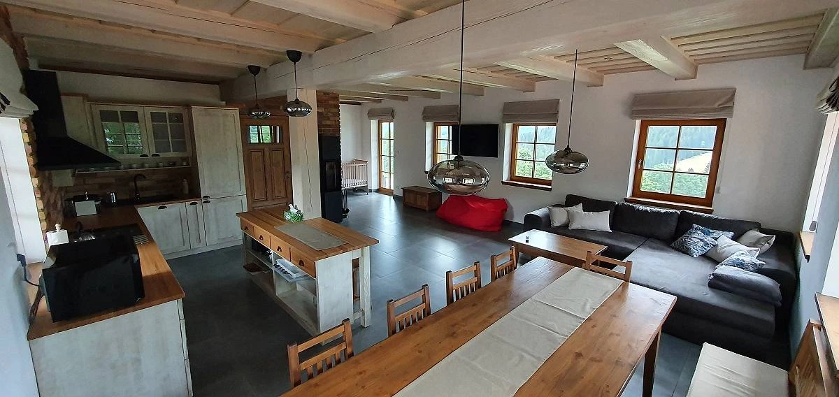 Kuchyň je kompletně zařízena s moderními spotřebiči a nabízí prostor pro společnou přípravu a vychutnávání jídel. Místnost je propojena s obývacím pokojem, kde je krb a další televizor, což vytvoří příjemnou atmosféru k relaxaci.
