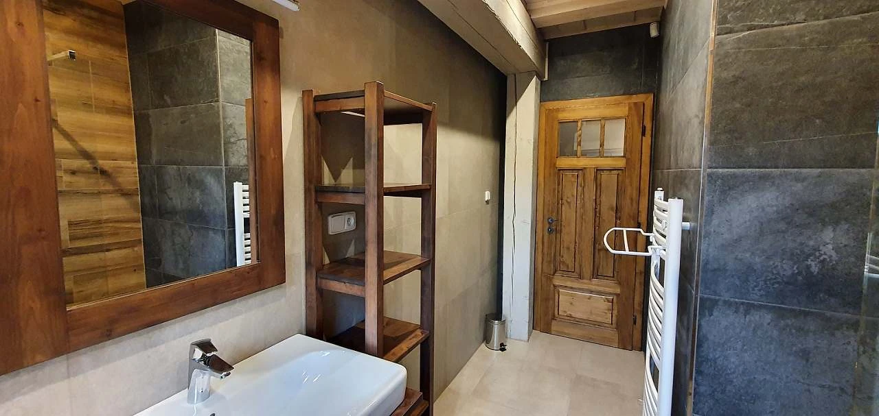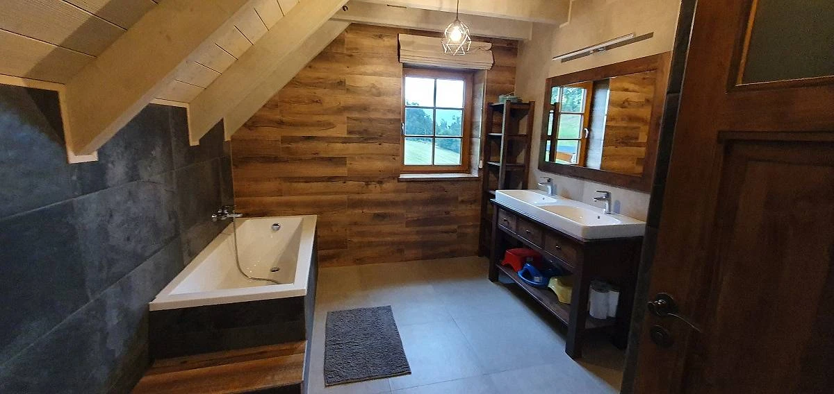 V přízemí je koupelna se sprchou a samostatné WC. Masážní sprcha u infrasauny. V patře je další koupelna s vanou, sprchou a WC + samostatné oddělené WC.