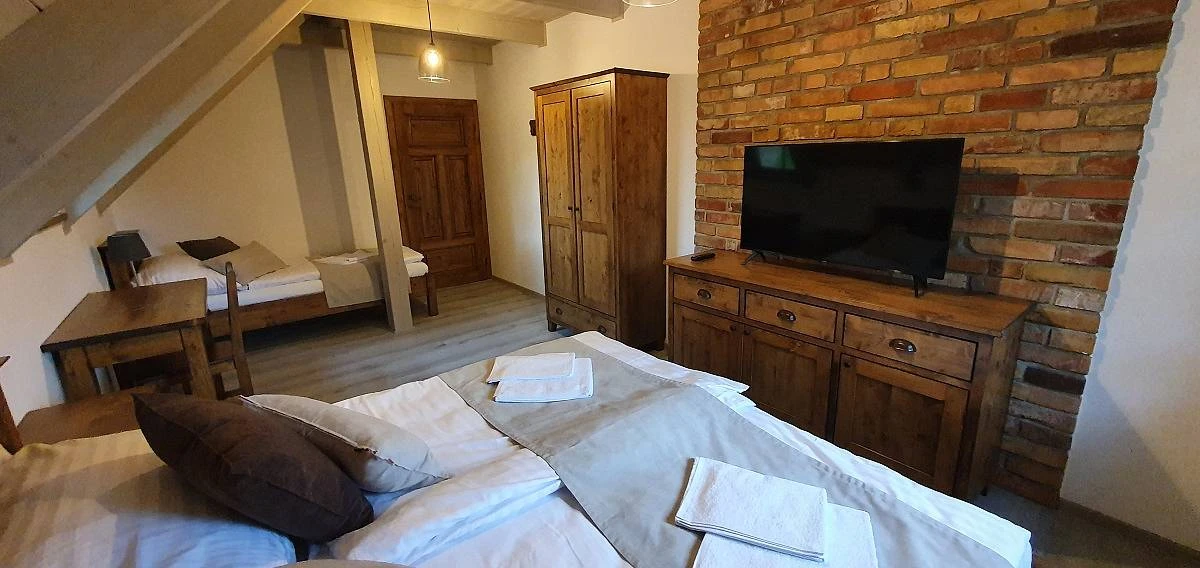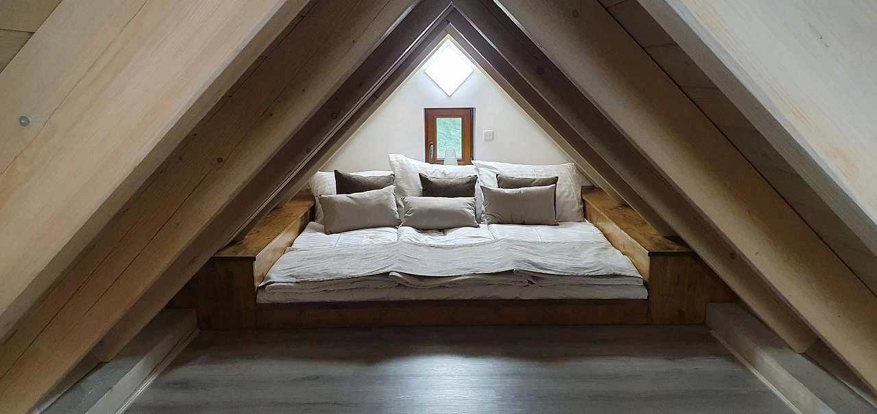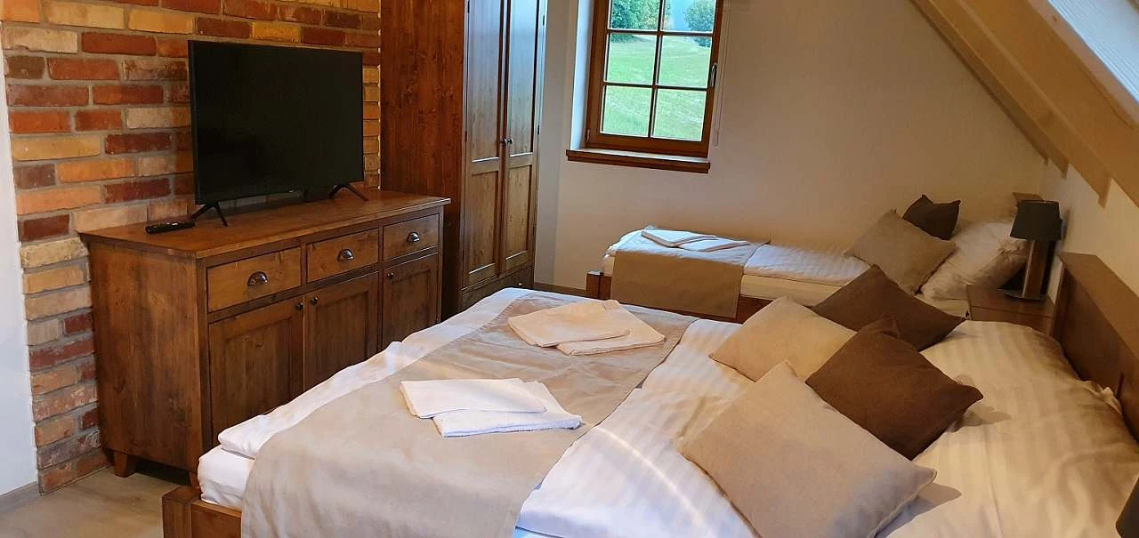 V přízemí je dvoulůžková ložnice, v patře jsou tři třílůžkové ložnice, ze dvou je výstup na hambálka, kde jsou další tři + tři lůžka. K dispozici jsou také dvě dětské postýlky. V každé ložnici je televize. Celkem je k dispozici 11 + 6 lůžek + 2 postýlky. Na Vašem pohodlí nám záleží, proto jsou pokojích matrace Latex Air tuhá strana, Visco Air paměťová pěna měkčí strana. Polštář a přikrývka mikrovlákno, náplň duté vlákno.