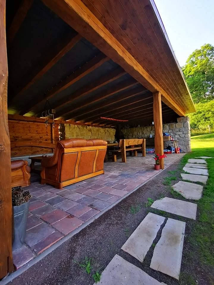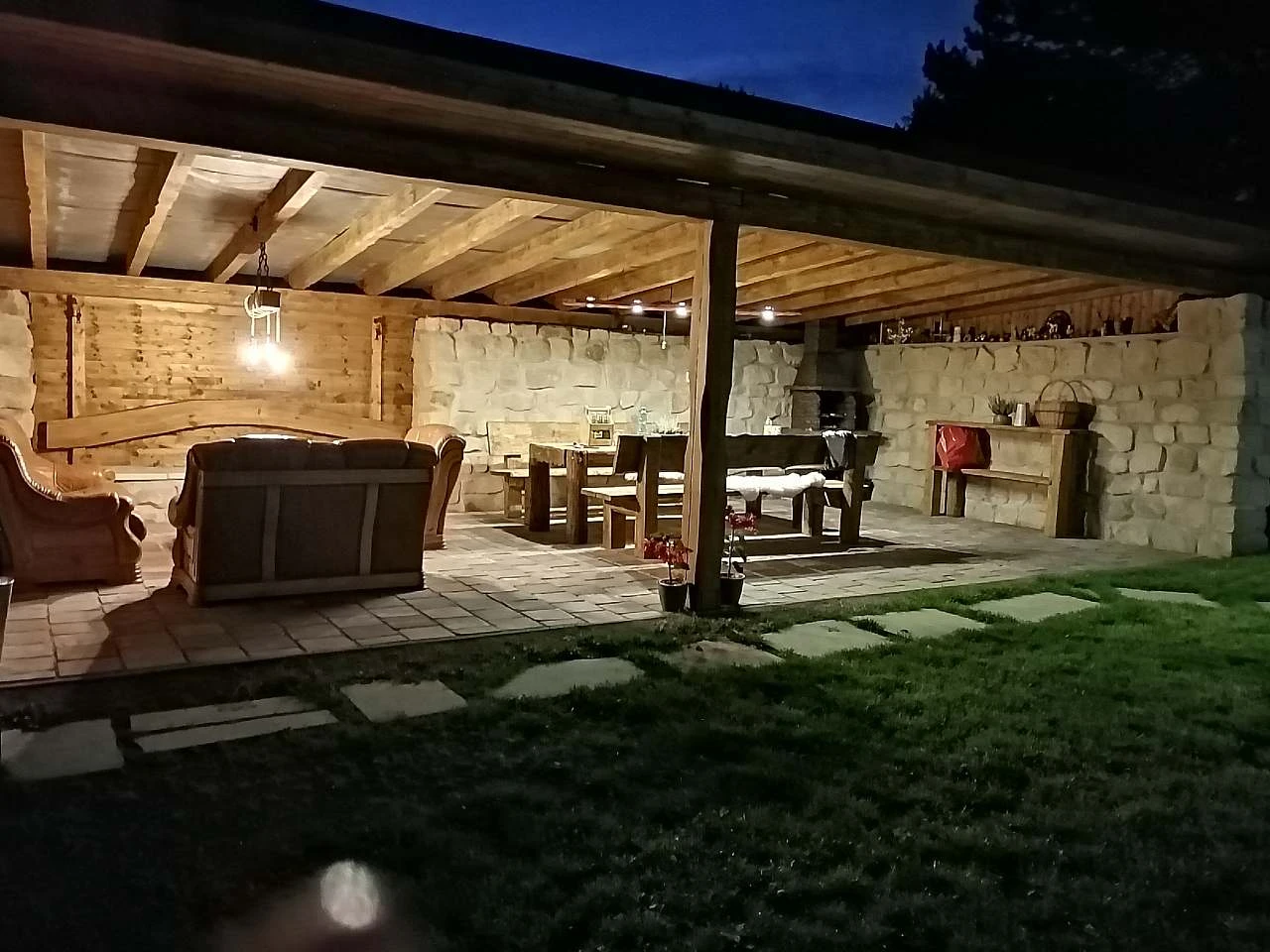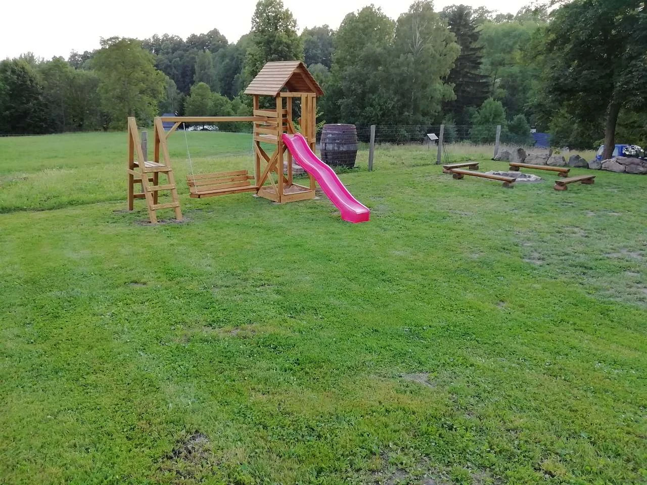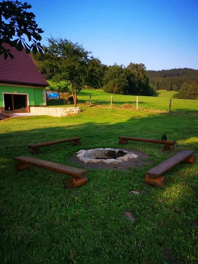 Na zahradě se nachází otevřená "stodola" s grilem na dřevěné uhlí, dřevěným nábytkem k posezení a pohodlným gaučem pro odpolední relaxaci. Dále je k dispozici velké ohniště s posezením, skluzavka, pískoviště a houpačka pro děti.