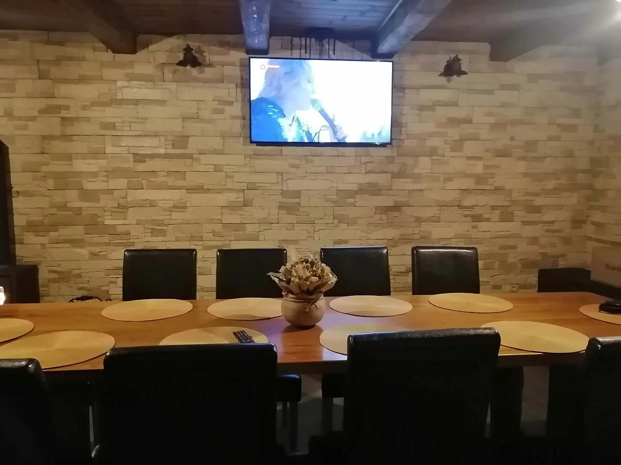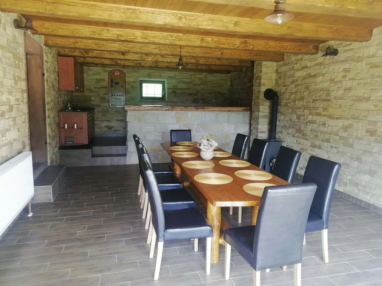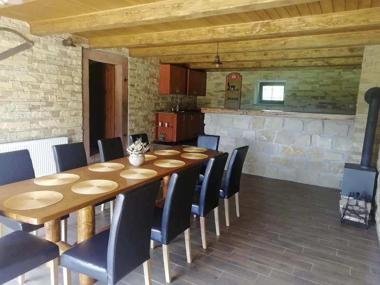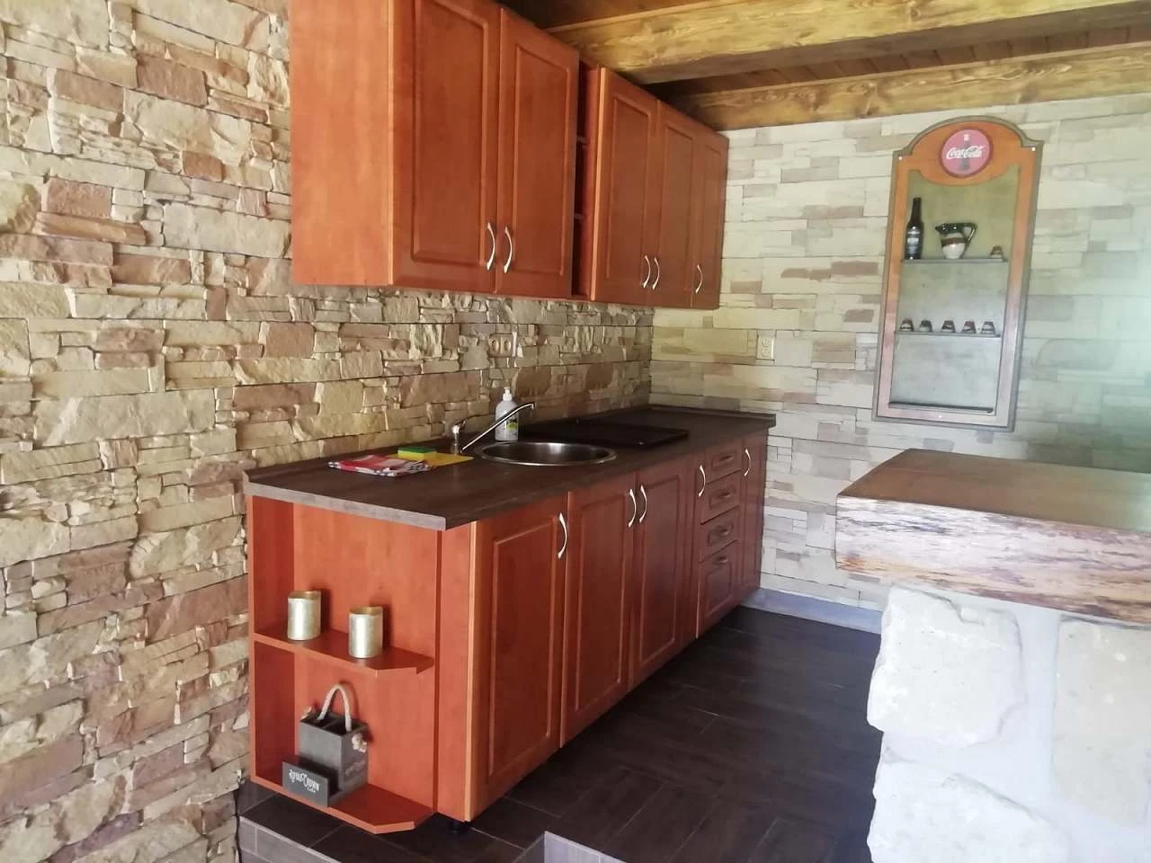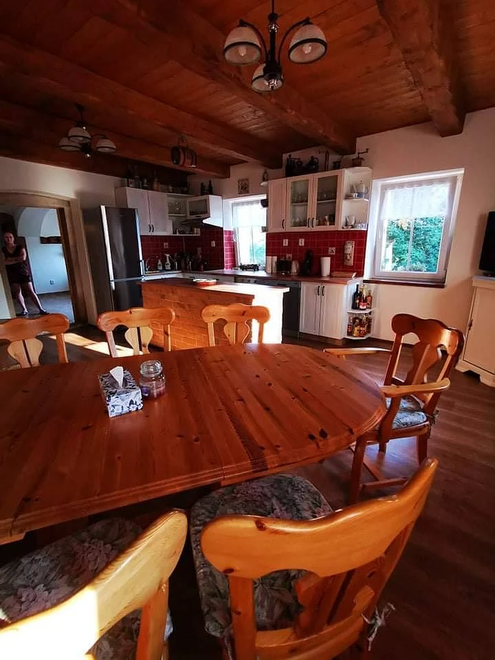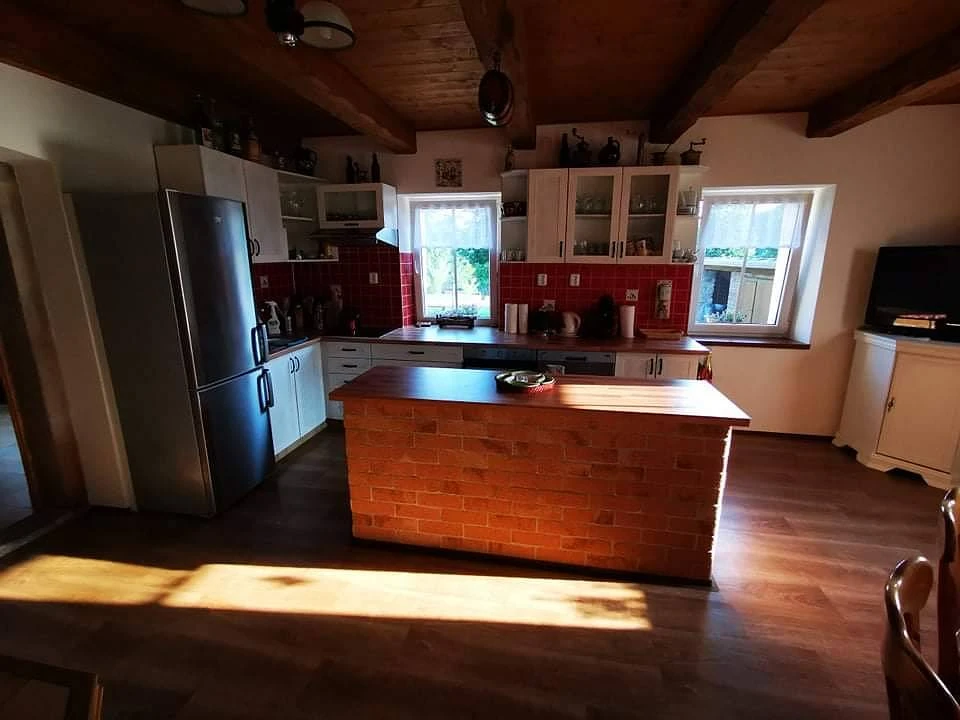 K dispozici je obytná kuchyň s jídelním stolem pro 8 osob, menším gaučem a TV. Kuchyň je vybavena sklokeramickou deskou, vestavěnou troubou, myčkou, rychlovarnou konvicí, kávovarem na kapsle a vším potřebným vybavením pro běžné vaření. Pro děti je na požádání možné připravit jídelní židličku.