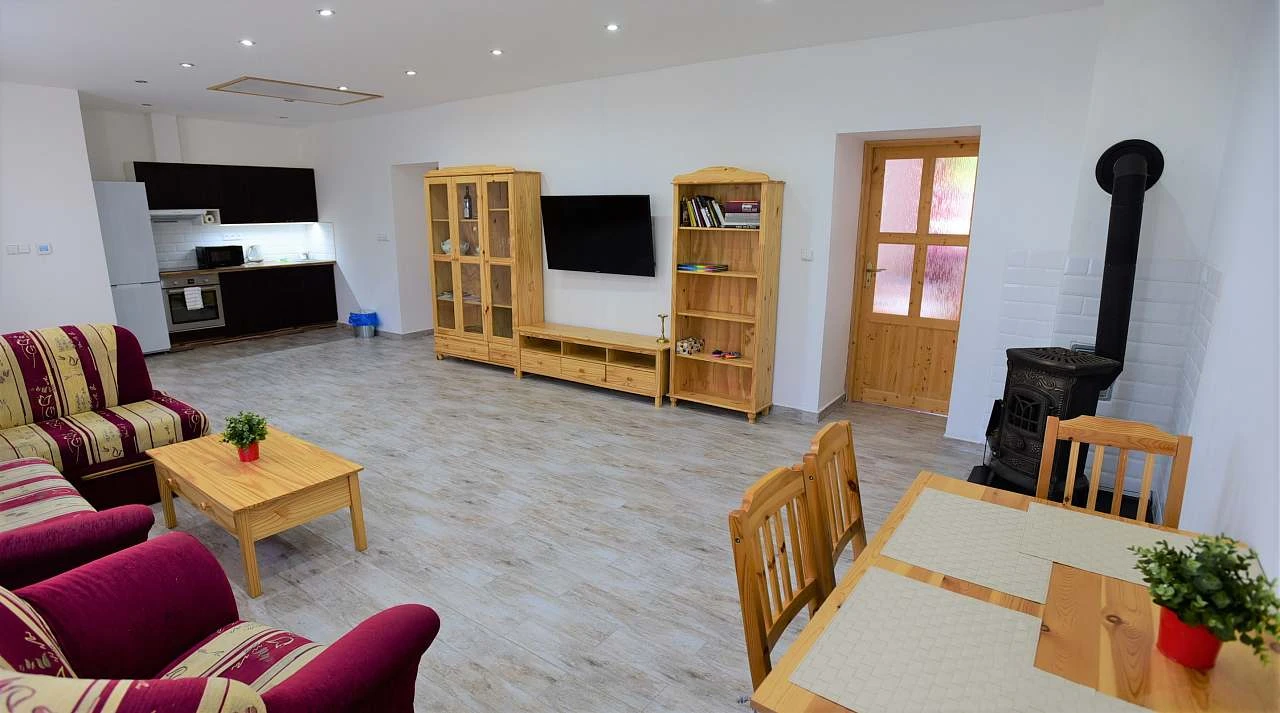 Velký obývací pokoj s plně vybaveným kuchyňským koutem a rozkládací sedací soupravou, smart televizí, WIFI, lednicí a pračkou, myčkou etc.. ložnice s manželskou postelí, druhá ložnice s dvěma lůžky, samostatné WC, Koupelna s vanou. Celková výměra ubytování je přes 90m².