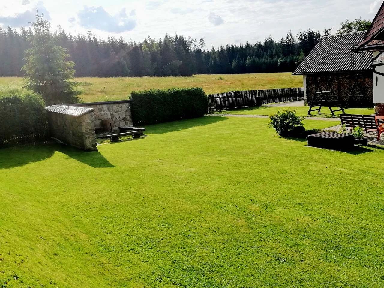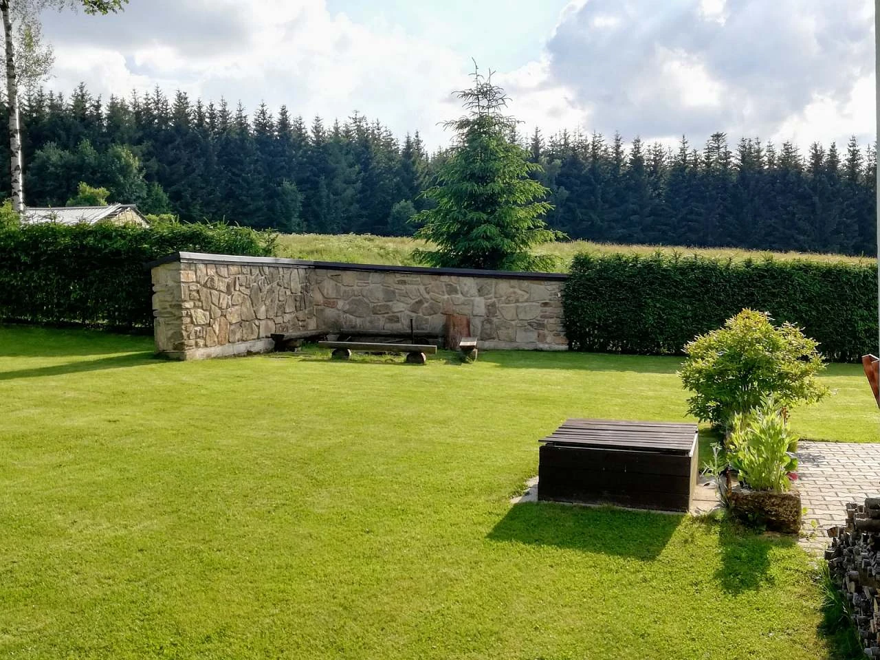 Objekt leží na zatravněném a oploceném pozemku - 1000 m2.Trávník je pravidelně udržován. Na pozemku je ohniště s grilem, zahradní nábytek, pískoviště a dětská houpačka.