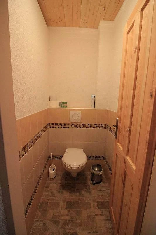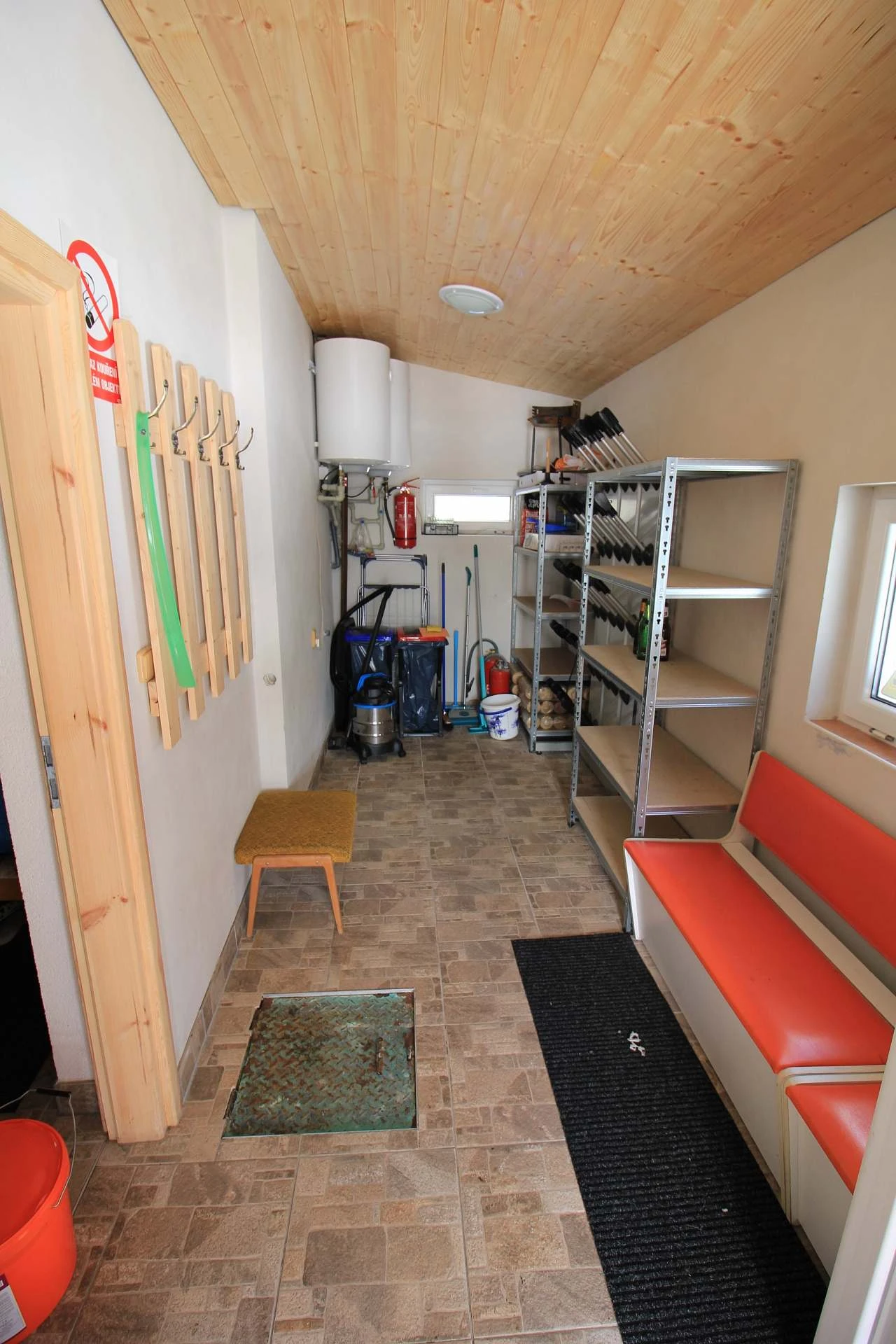Sociální zařízení zahrnuje v přízemí dvě sprchy, dvě WC a dvě umyvadla, zatímco v patře je jedno WC a jedno umyvadlo. K dispozici je vybavená kuchyň s nově zabudovanou myčkou nádobí. Vně objektu je terasa s posezením a grilovací domek. Parkování je možné přímo u chalupy pro pět aut, další velké parkoviště se nachází přibližně 300 metrů od objektu.