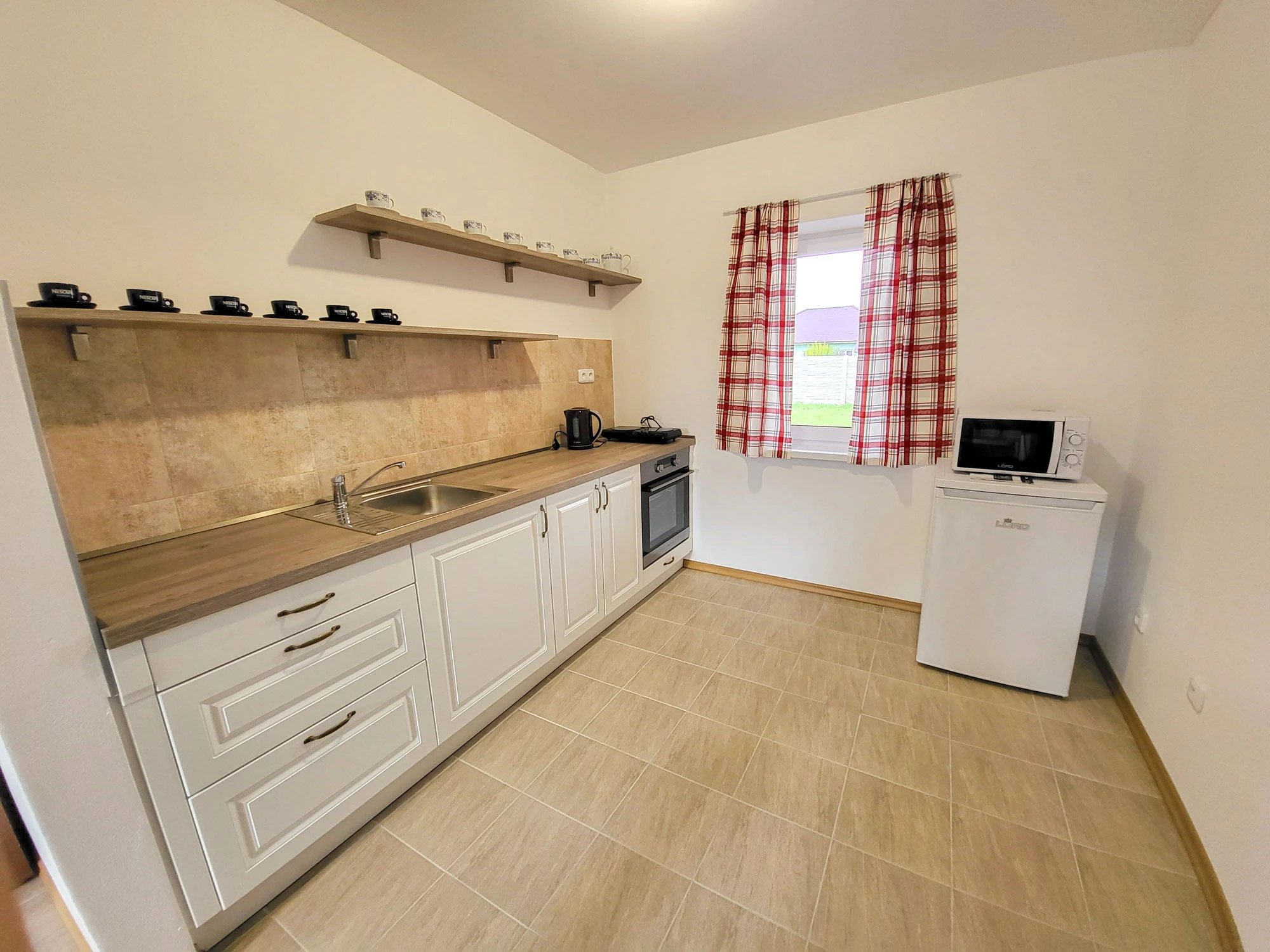 - Všechny apartmány jsou kompletně zařízené a vybavené kuchyní s lednicí, mikrovlnnou troubou, troubou, dvouplotýnkovým vařičem, rychlovarnou konvicí, základním nádobím a náčiním