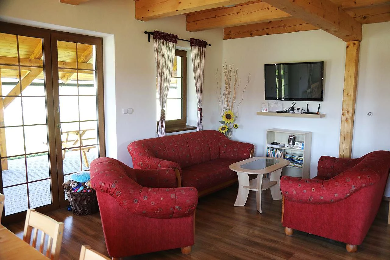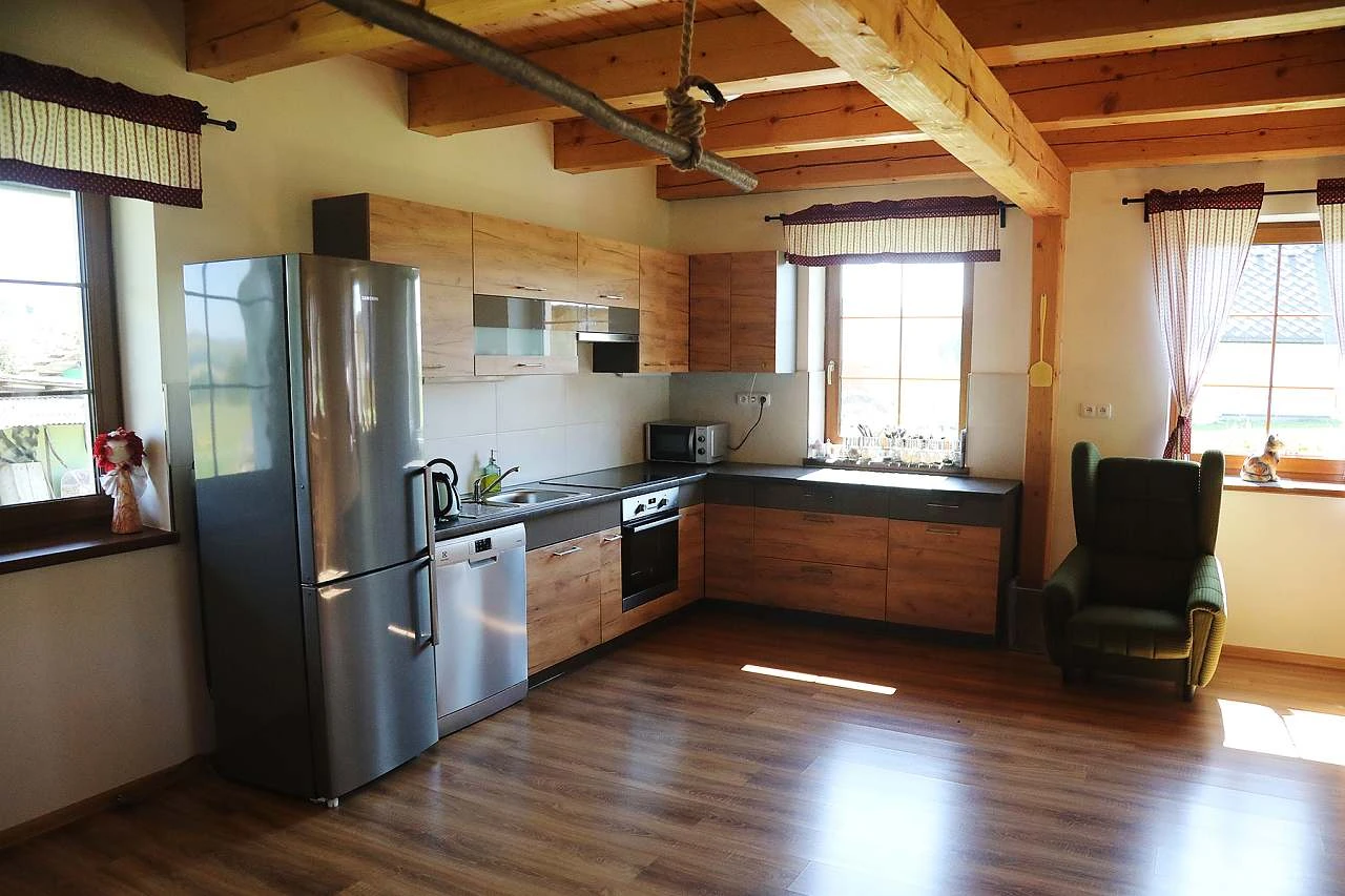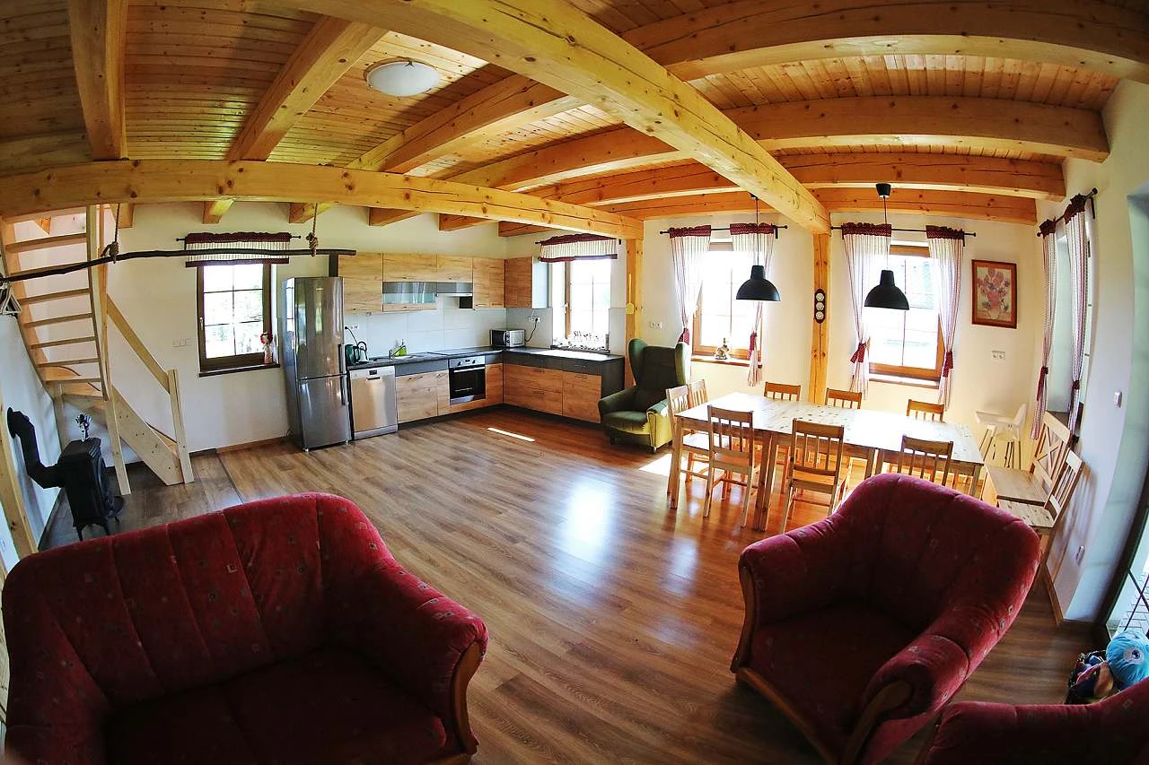 Chalupa nabízí prostornou společenskou místnost s krbem, televizí a posezením. Součástí je plně vybavená kuchyně s myčkou nádobí, kombinovanou lednicí, indukční deskou, troubou, mikrovlnkou a rychlovarnou konvicí.