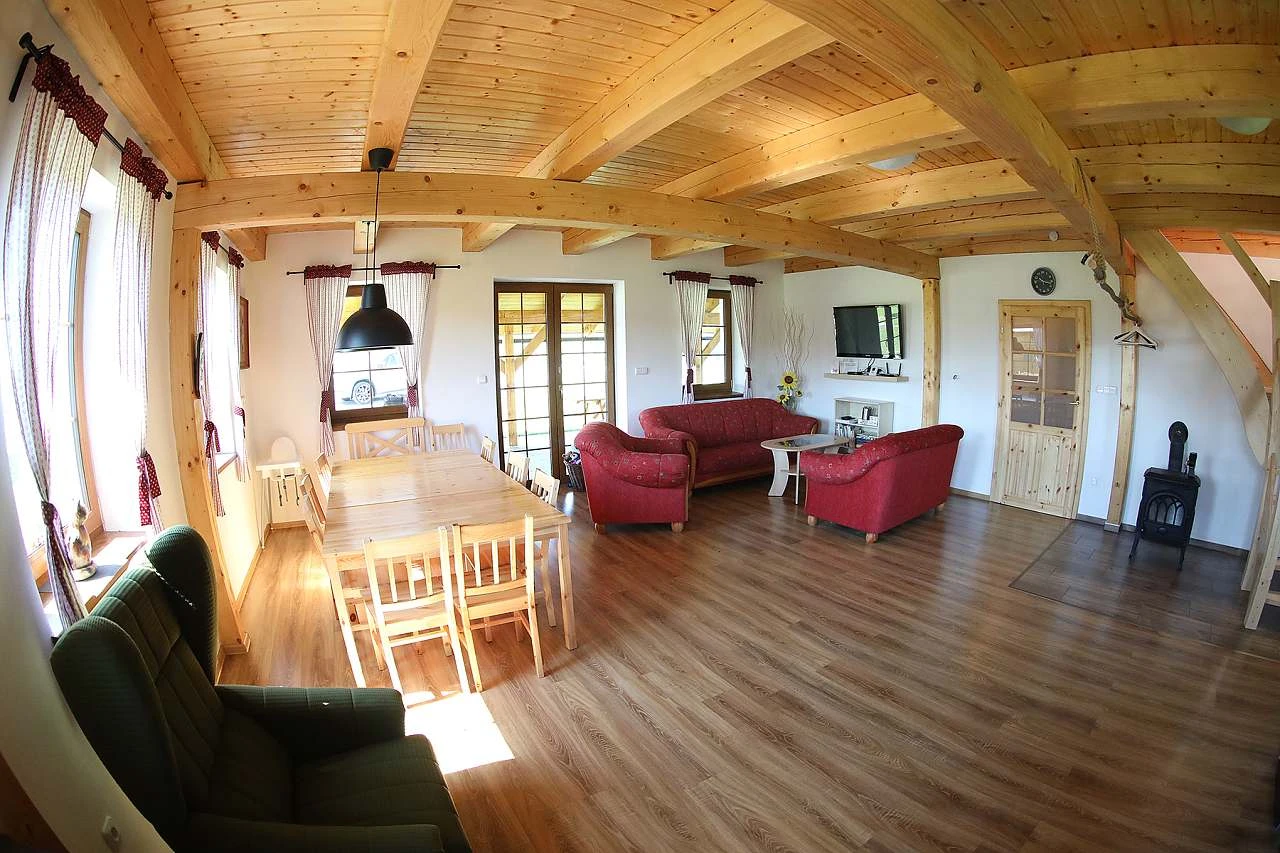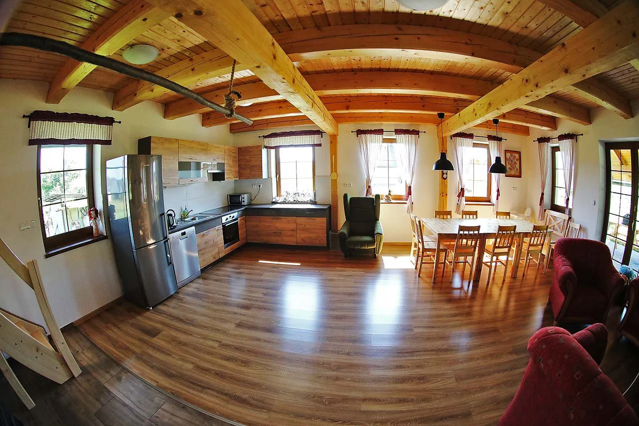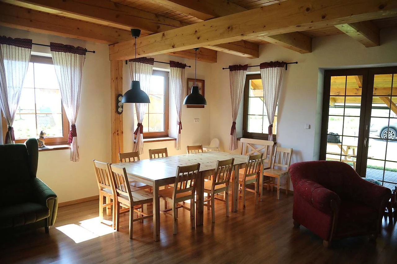 Chalupa nabízí prostornou společenskou místnost s krbem, televizí a posezením. Součástí je plně vybavená kuchyně s myčkou nádobí, kombinovanou lednicí, indukční deskou, troubou, mikrovlnkou a rychlovarnou konvicí.
