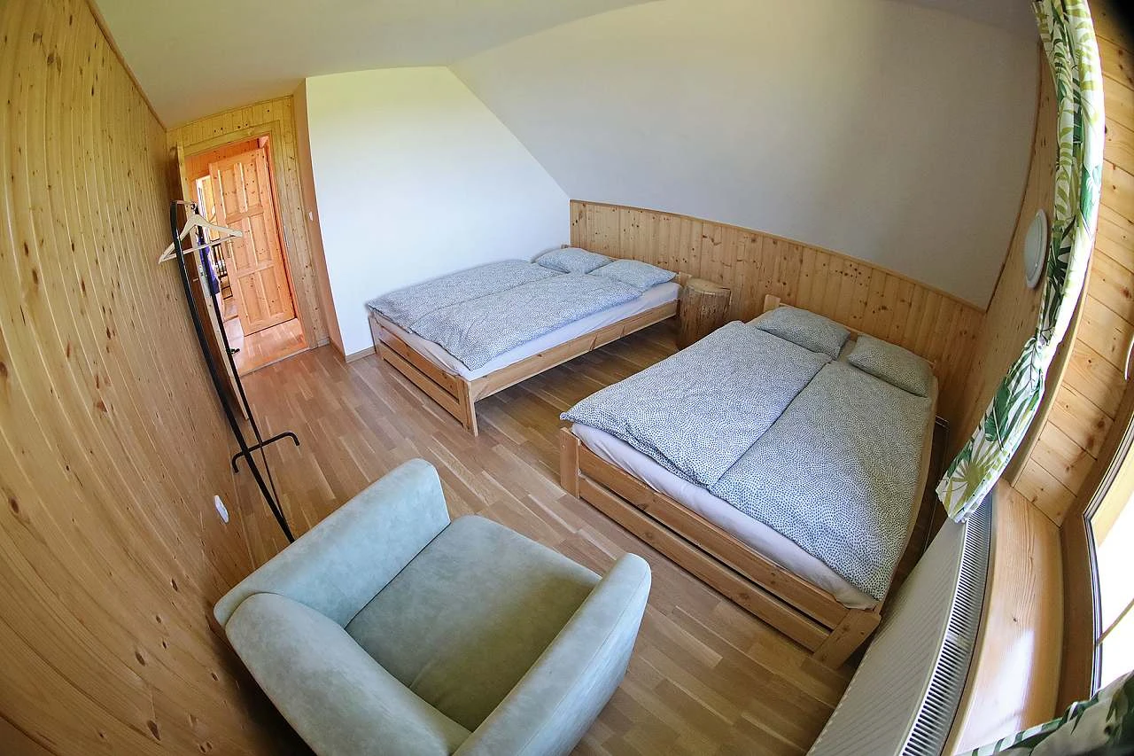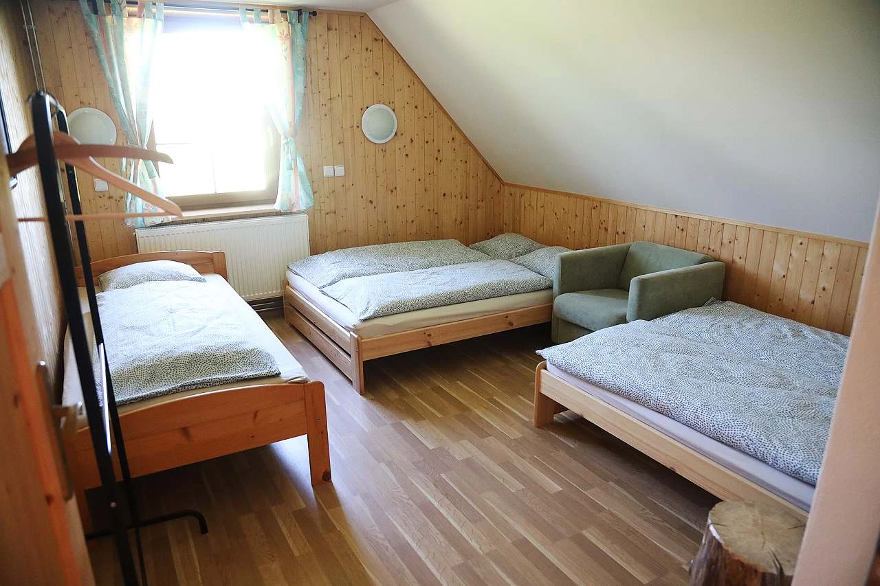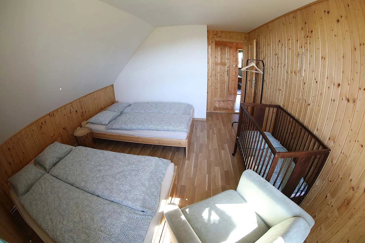 V patře se nachází čtyři ložnice (tři čtyřlůžkové a jedna pětilůžková) s manželskými i samostatnými postelemi. K dispozici jsou tři koupelny, samostatná toaleta a pračka.
