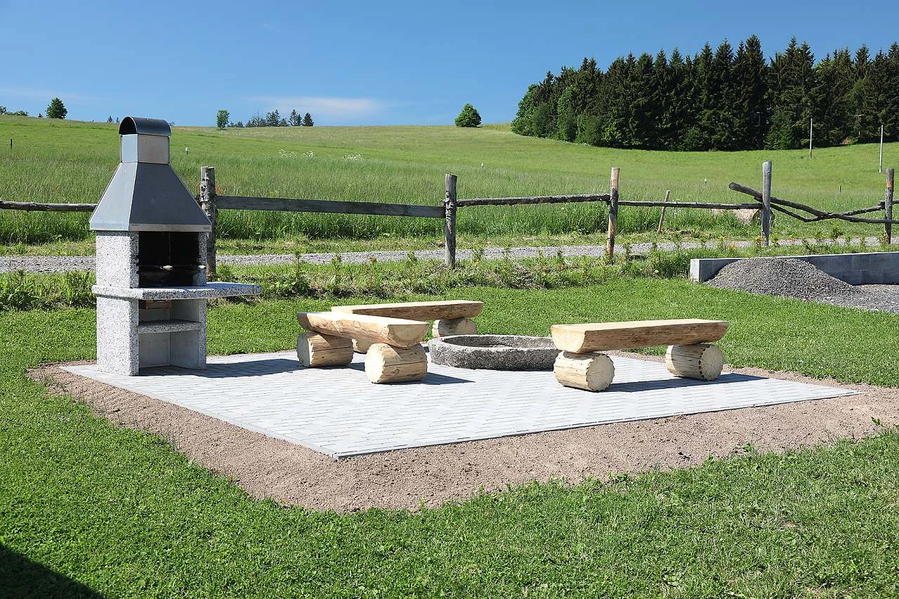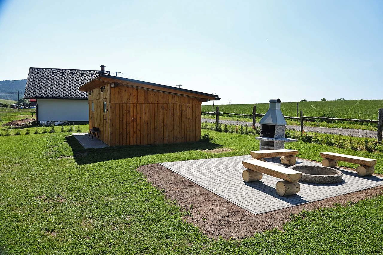 Venkovní prostor zahrnuje terasu se zahradním posezením, gril, ohniště a pískoviště pro děti. Sportovní vyžití umožňuje hřiště na míčové hry.
