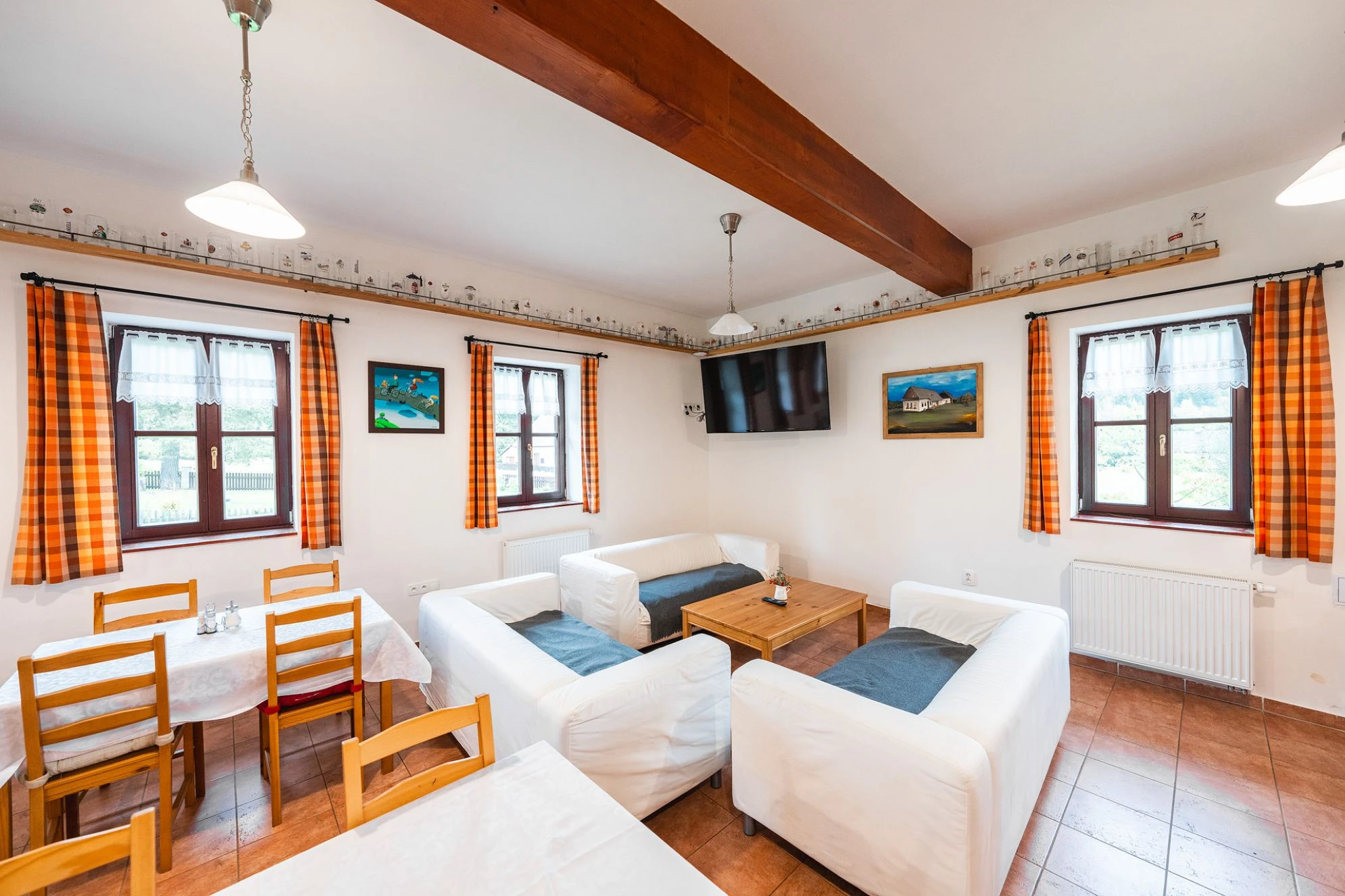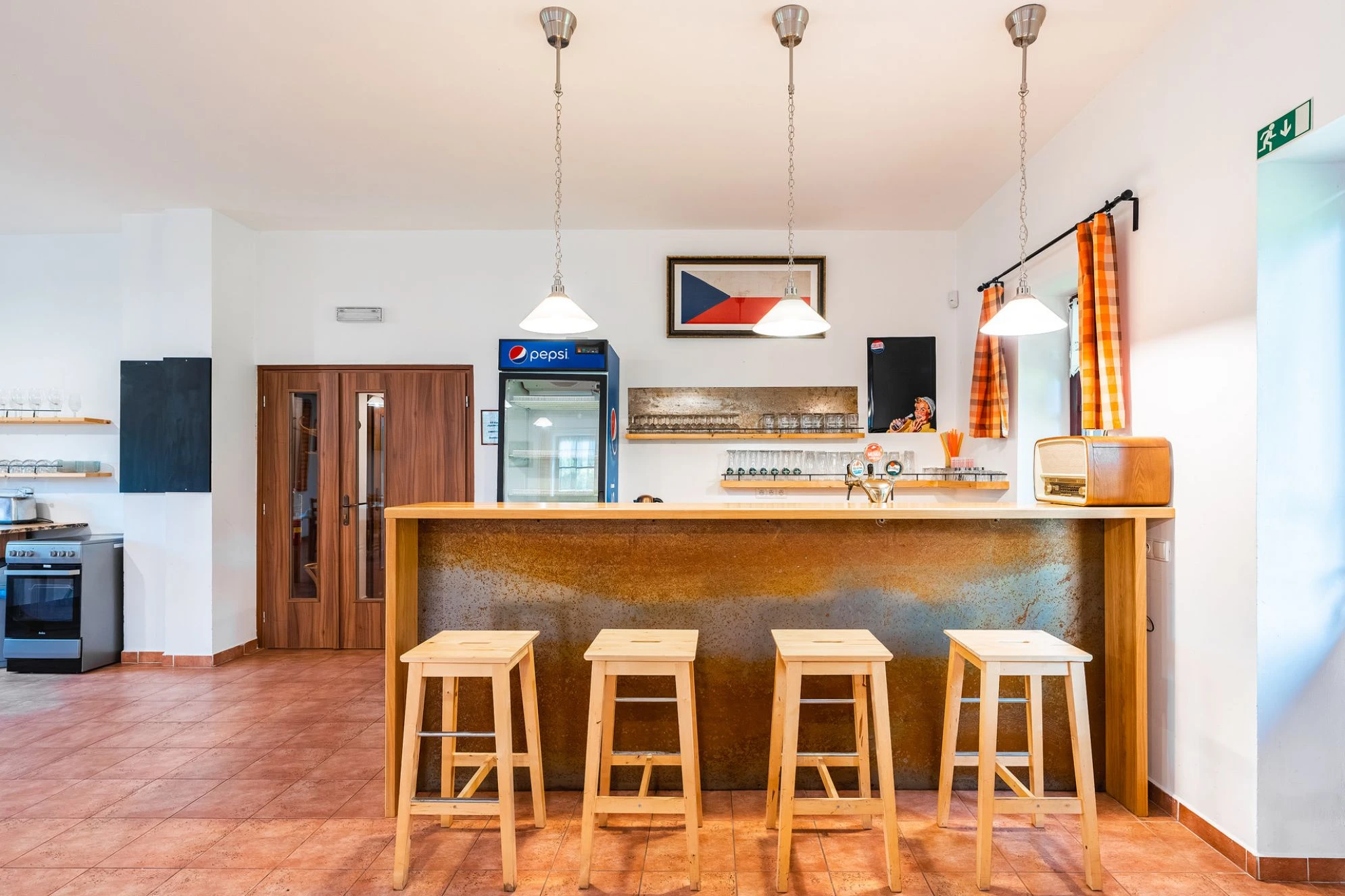 V rámci pronájmu této chalupy budete mít k dispozici prostornou společenskou místnost s barem, možností pronájmu pípy, lednicí, elektrickým sporákem a troubou, kompletním kuchyňským vybavením a velkoplošnou televizí.