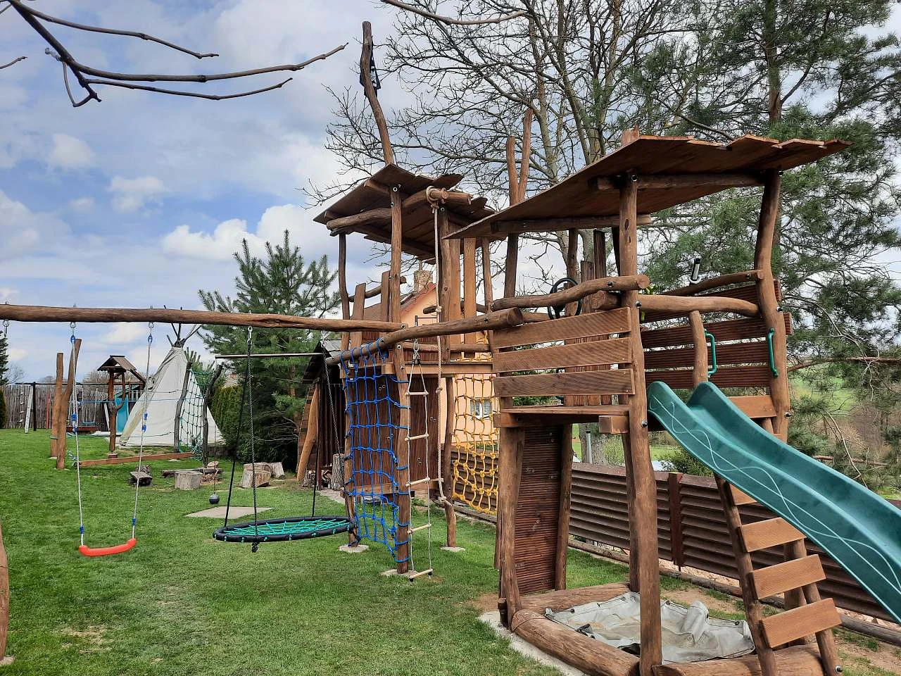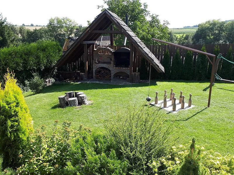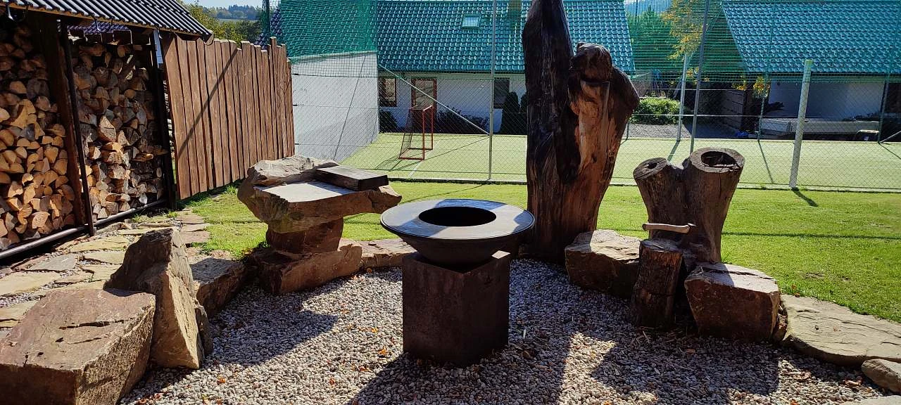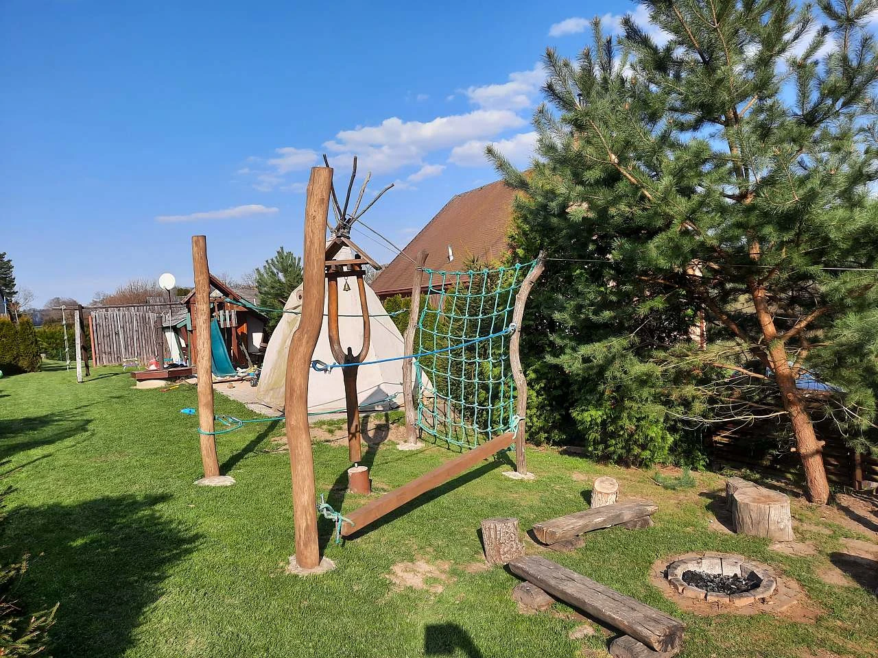 Venkovní zázemí jednotlivých chalup je velmi bohaté. Najdeme zde udržovanou zahradu přizpůsobenou pobytu rodin s dětmi – trampolínu, venkovní bazén/vířivku, dětské hřiště, lavičky, gril, ohniště a nově otevřené multifunkční hřiště s umělou trávou pro různé sporty. K dispozici jsou také společenské hry, šipky a další aktivity pro dospělé.