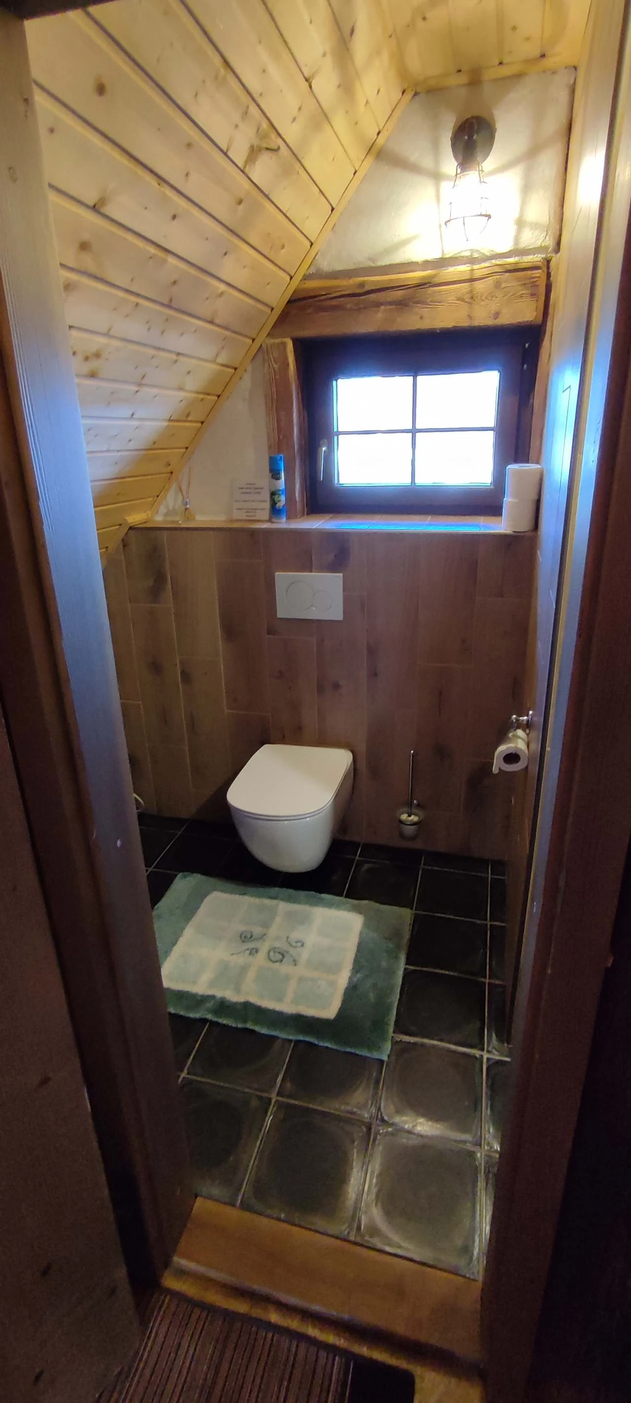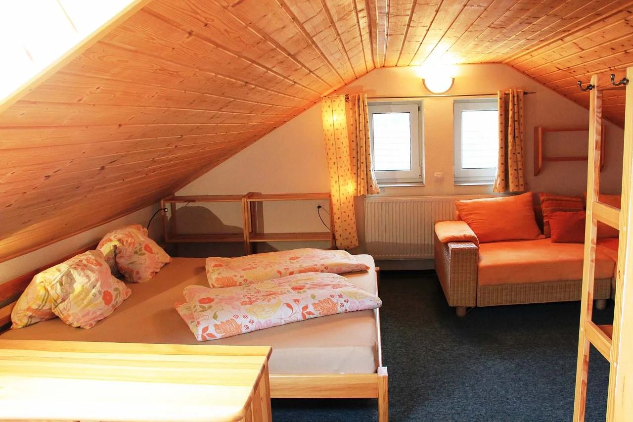 V podkroví je apartmán s koupelnou. Postel je přes celý pokoj, která je uprostřed přepažena.