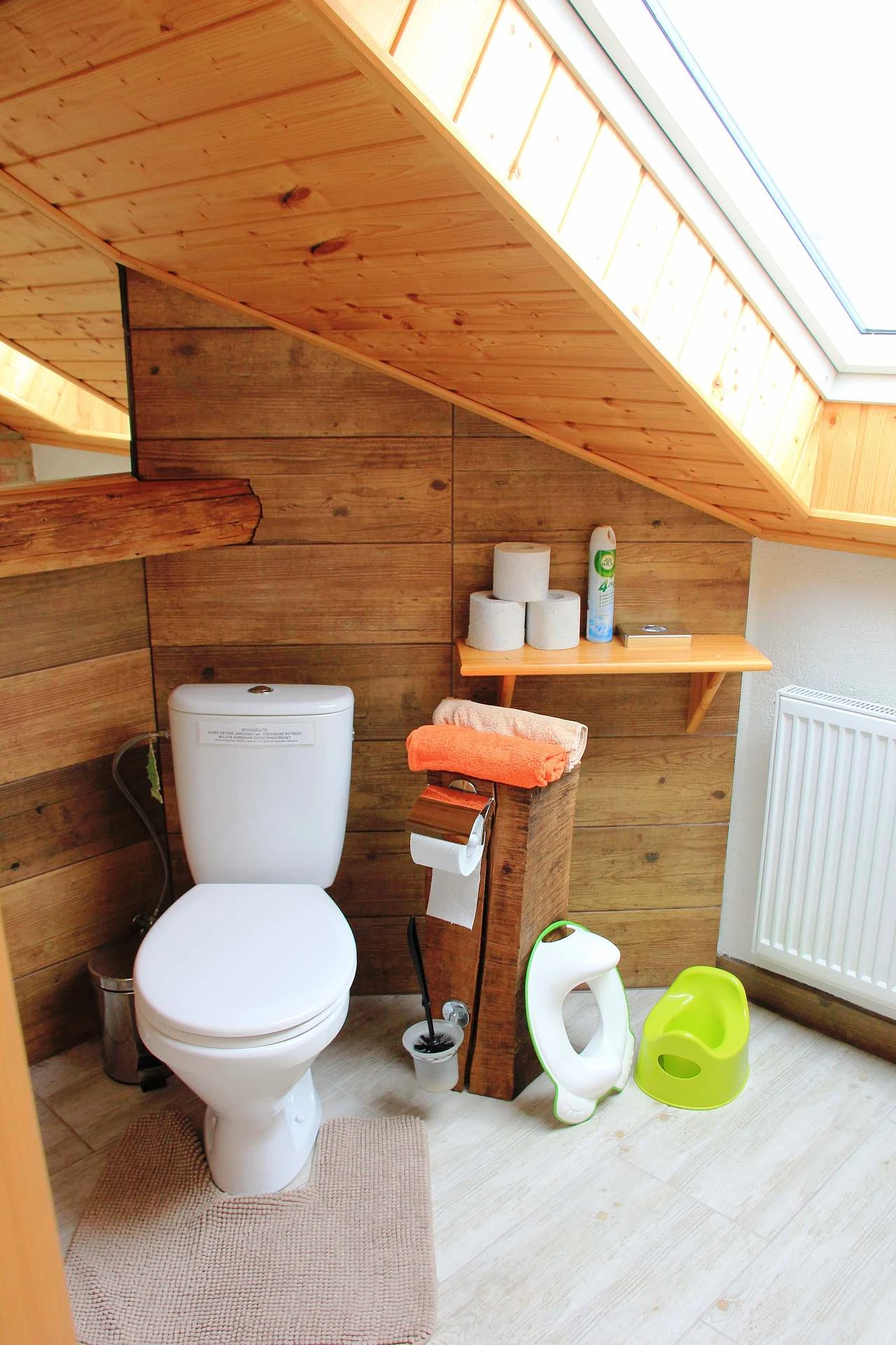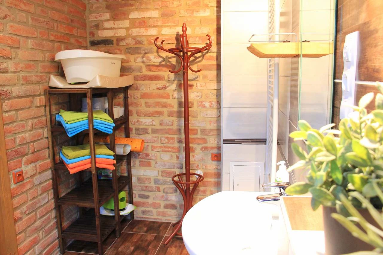 Koupelna - sprchový kout, WC, ručníky, osušky, mýdlo na ruce, toaletní papír, vysoušeč vlasů, pro malé děti vanička, lehátko do vaničky, přebalovací podložka, nočníky, adaptéry na WC.