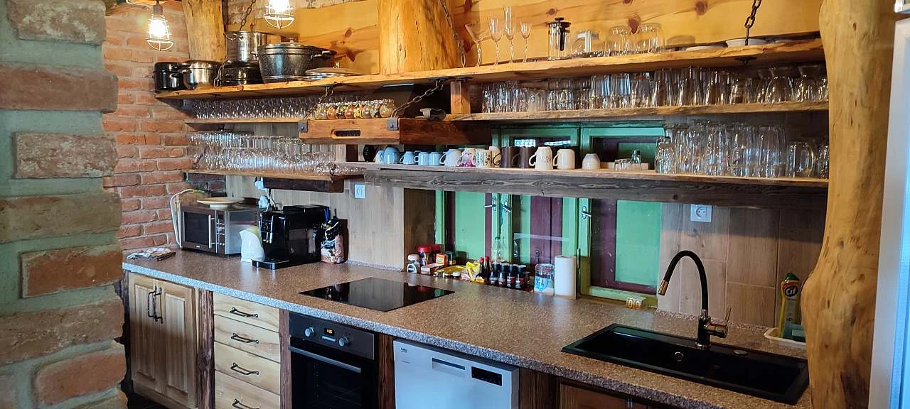 Chalupa je jeden veliký prostor s kuchyní, posezením pro 25- 30 lidí a poklidným koutkem u krbu s koženou sedačkou.