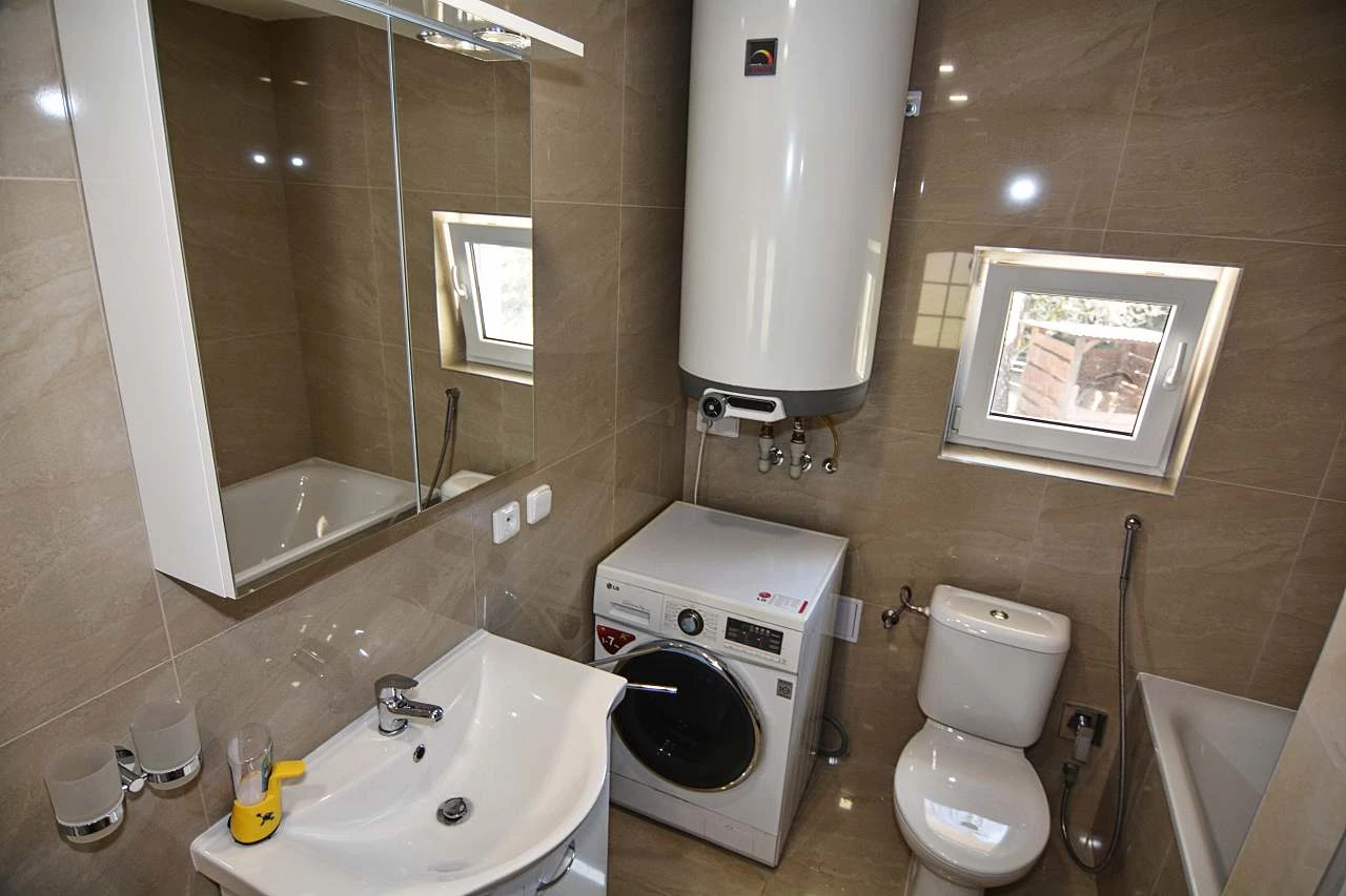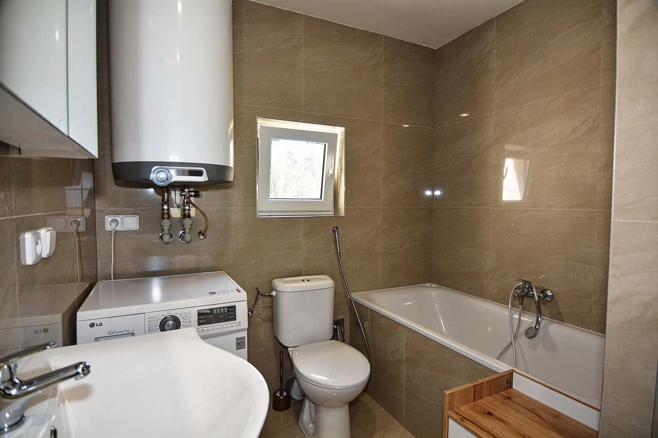 Splachovací WC 2x, koupelna tepla studená voda, sprchový box. Koupelna a WC je přístupná venkem přes terasu.
