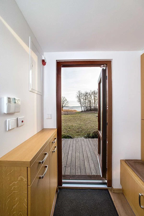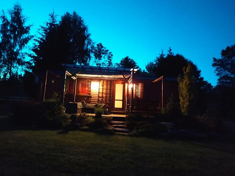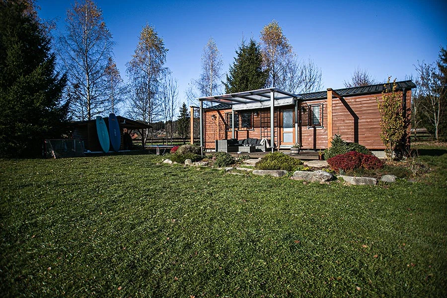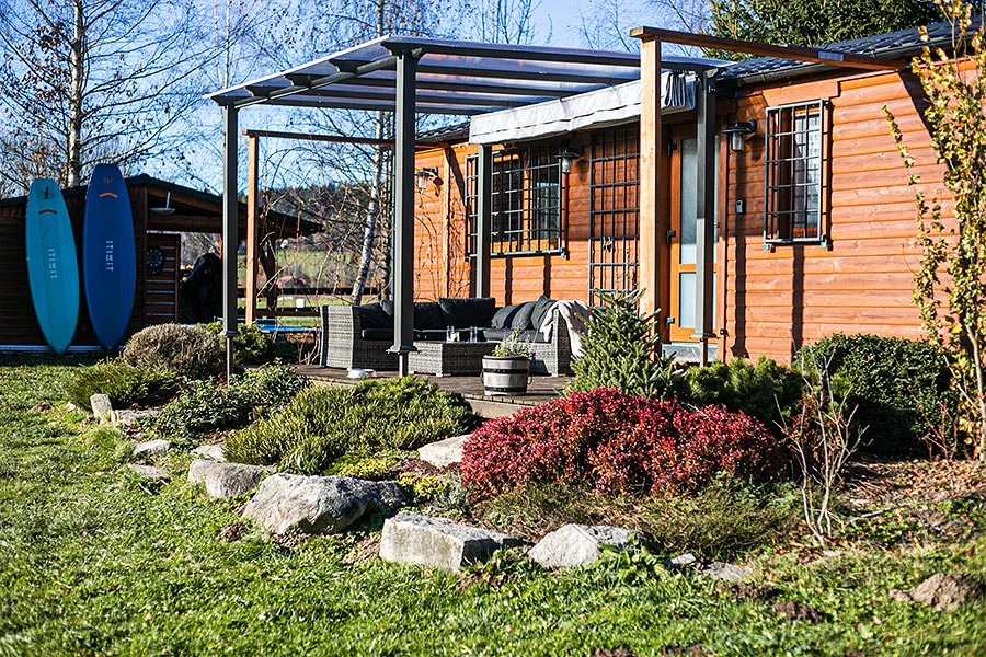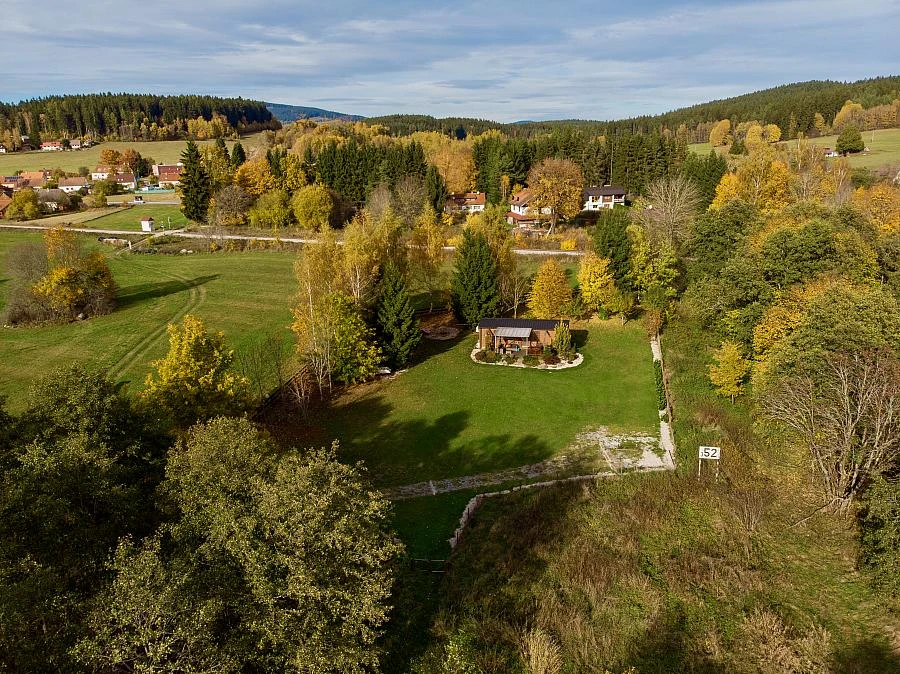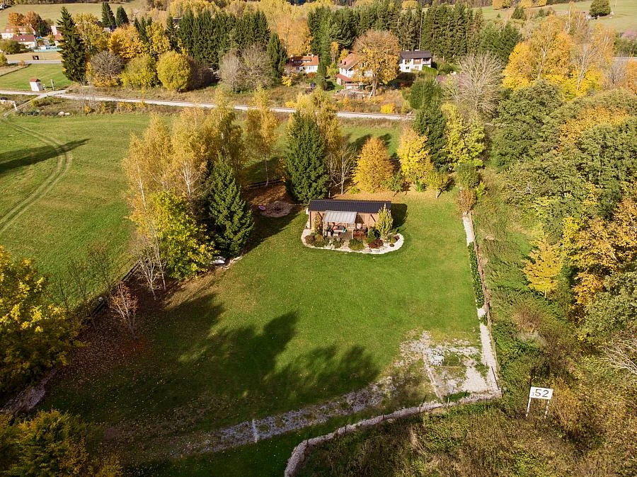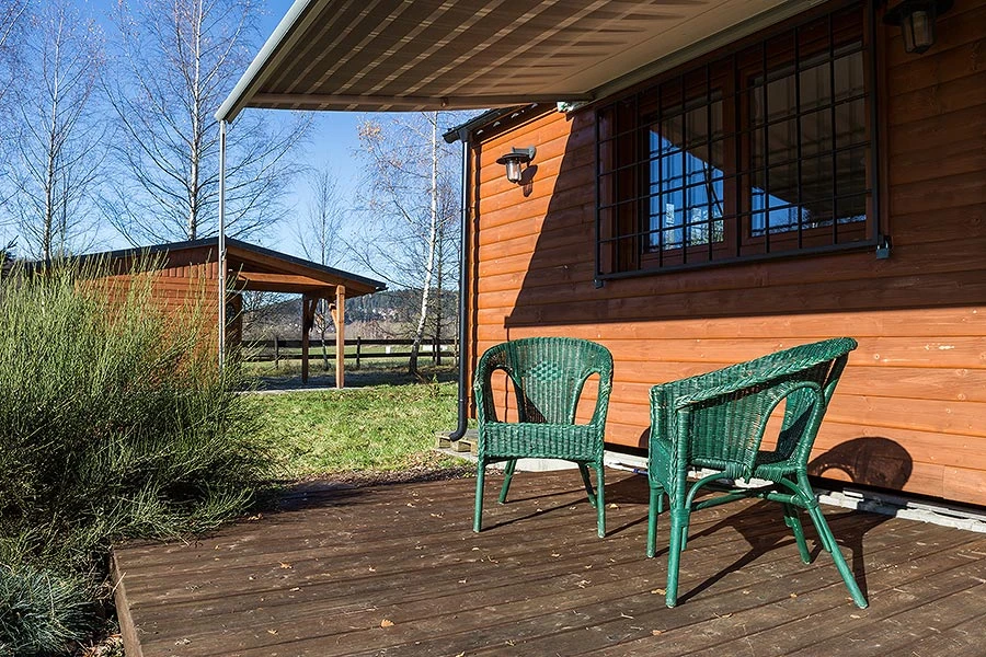 Chata má dvě ložnice, přičemž jedna je vybavena manželskou postelí a druhá palandou. K dispozici je také koupelna se sprchovým koutem a toaletou. Z obývací místnosti vede přímý vstup na terasu, kde najdete venkovní posezení. Na pozemku je možné využít venkovní krb, gril nebo ohniště. K dispozici je také hřiště na plážový volejbal a možnost rybolovu na přehradě Lipno.