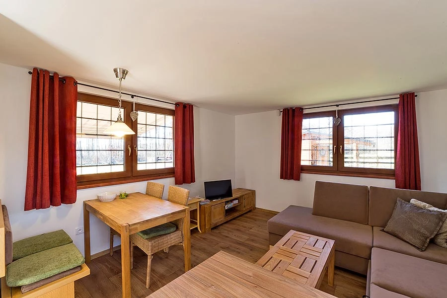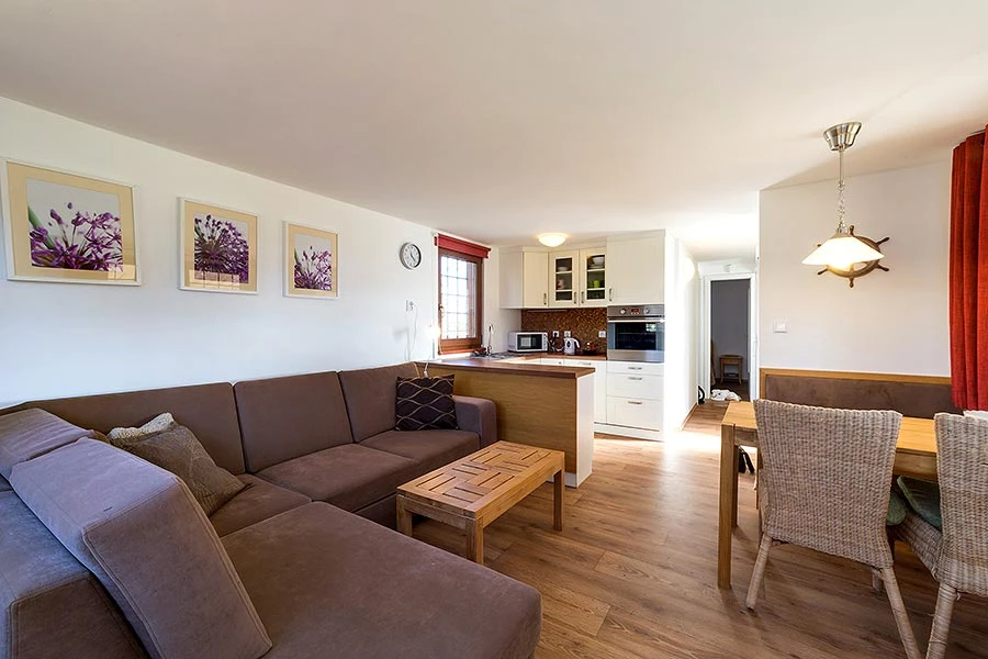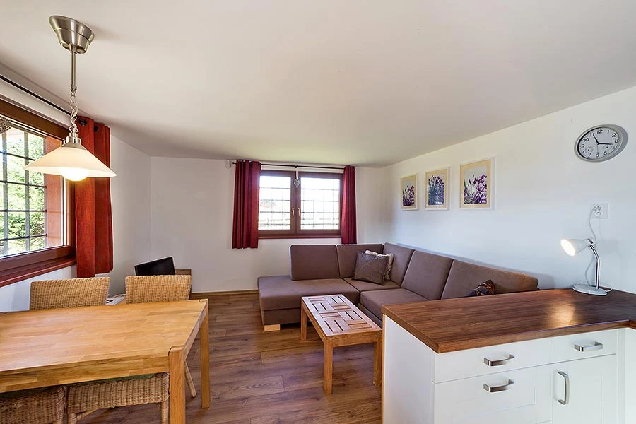 - Obývací místnost: gauč (rozkládací lůžko pro 2 osoby), jídelní stůl pro 4 osoby, televize s kabelovým příjmem