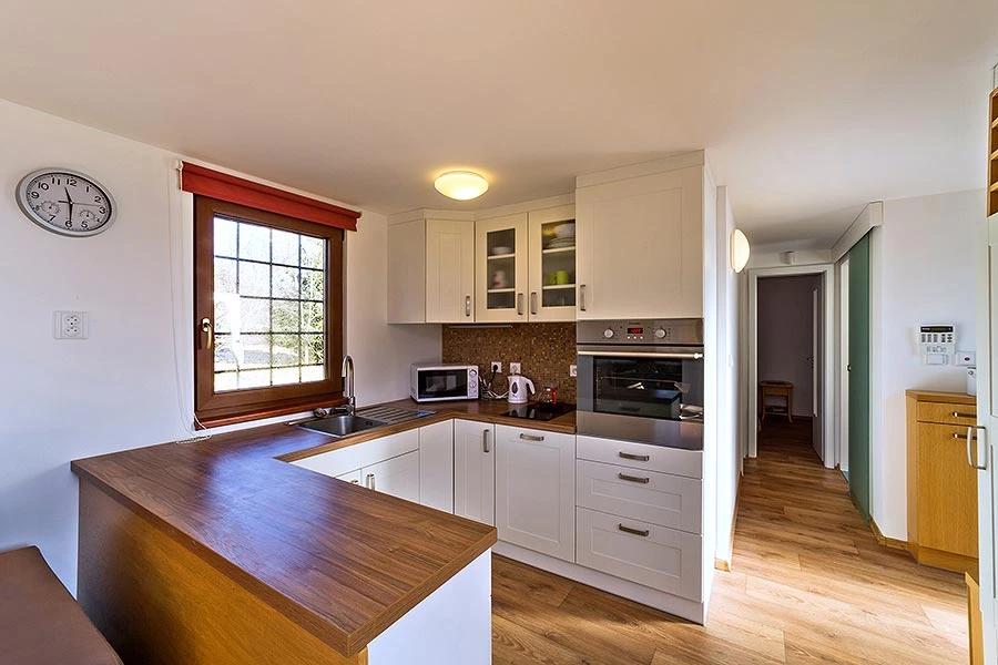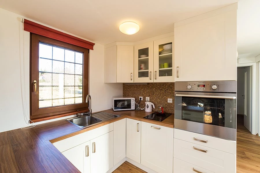 - Kuchyňský kout: keramická varná deska, elektrická trouba, mikrovlnná trouba, lednice, rychlovarná konvice
