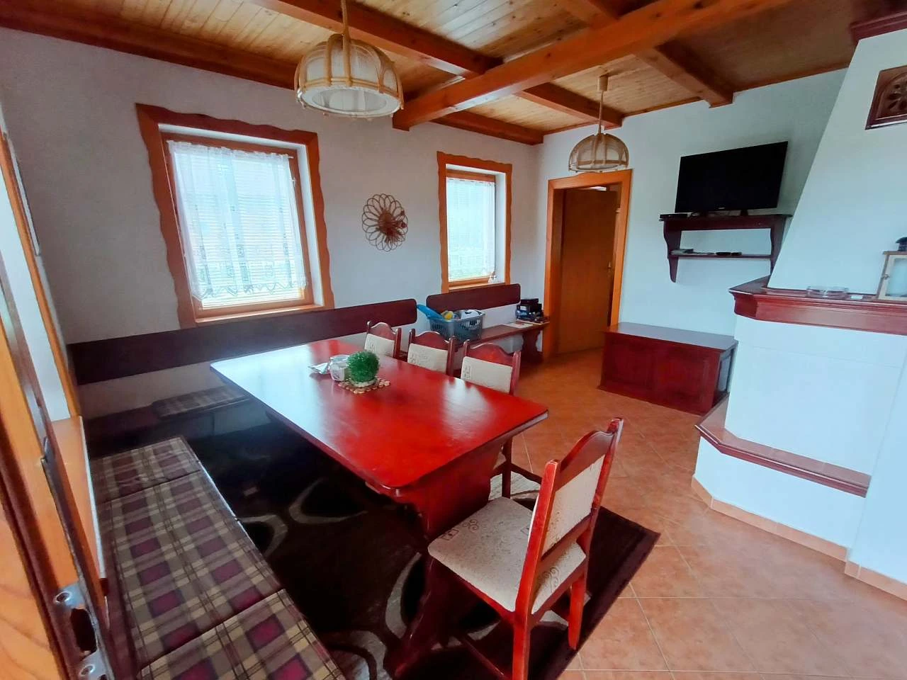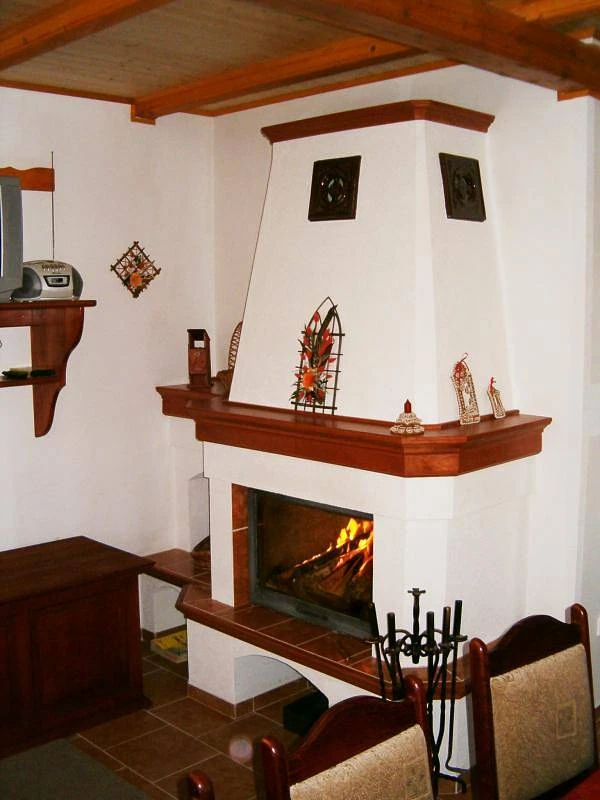 Vybavení: Kuchyň je plně vybavena běžnými spotřebiči a je propojena s obývacím pokojem, ve kterém je krbová vložka s teplovzdušným rozvodem a posezení.
