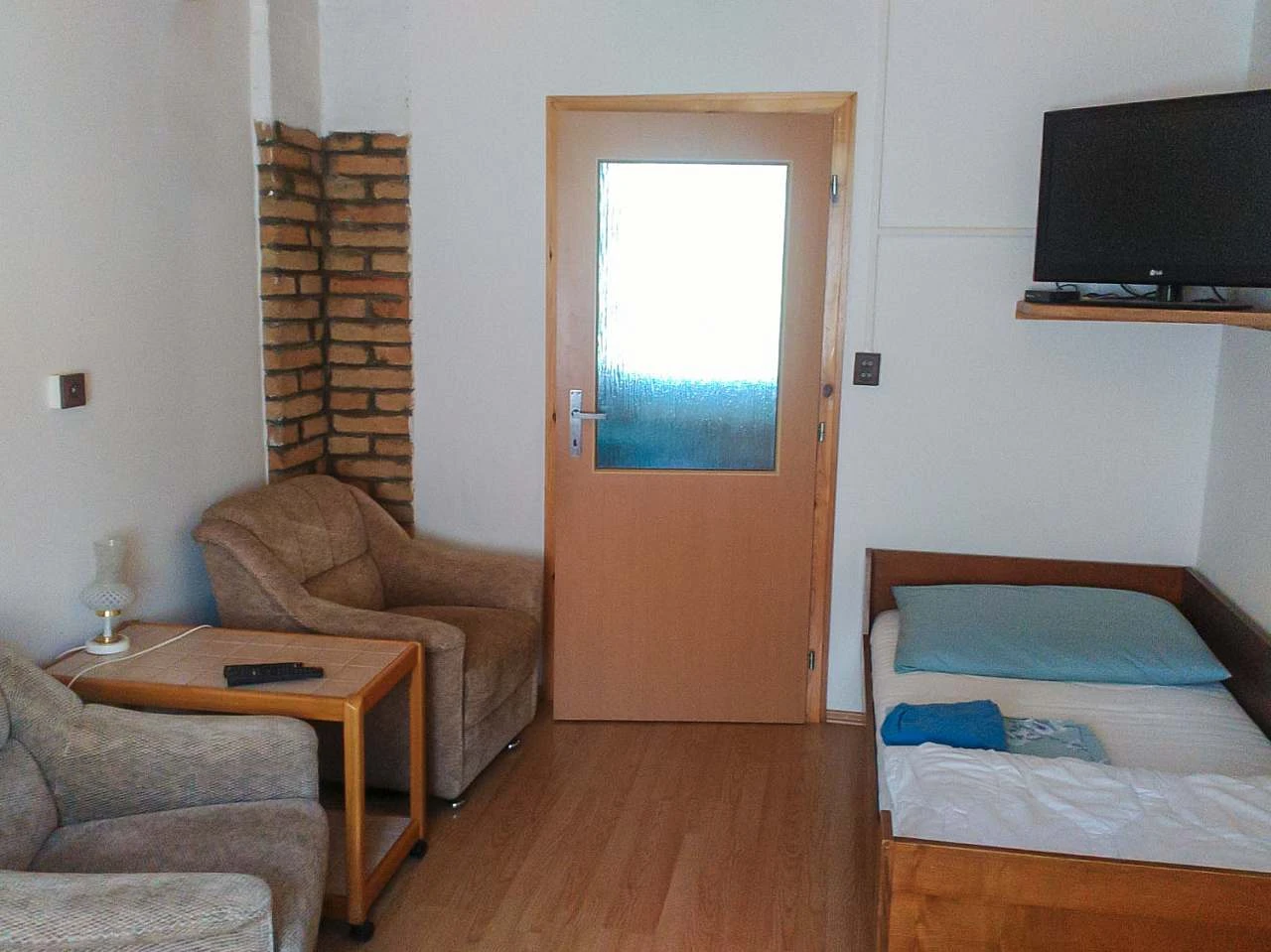 Obývací pokoj: 1x1 lůžko, 2x křeslo, šatní skříň, TV, stolek.