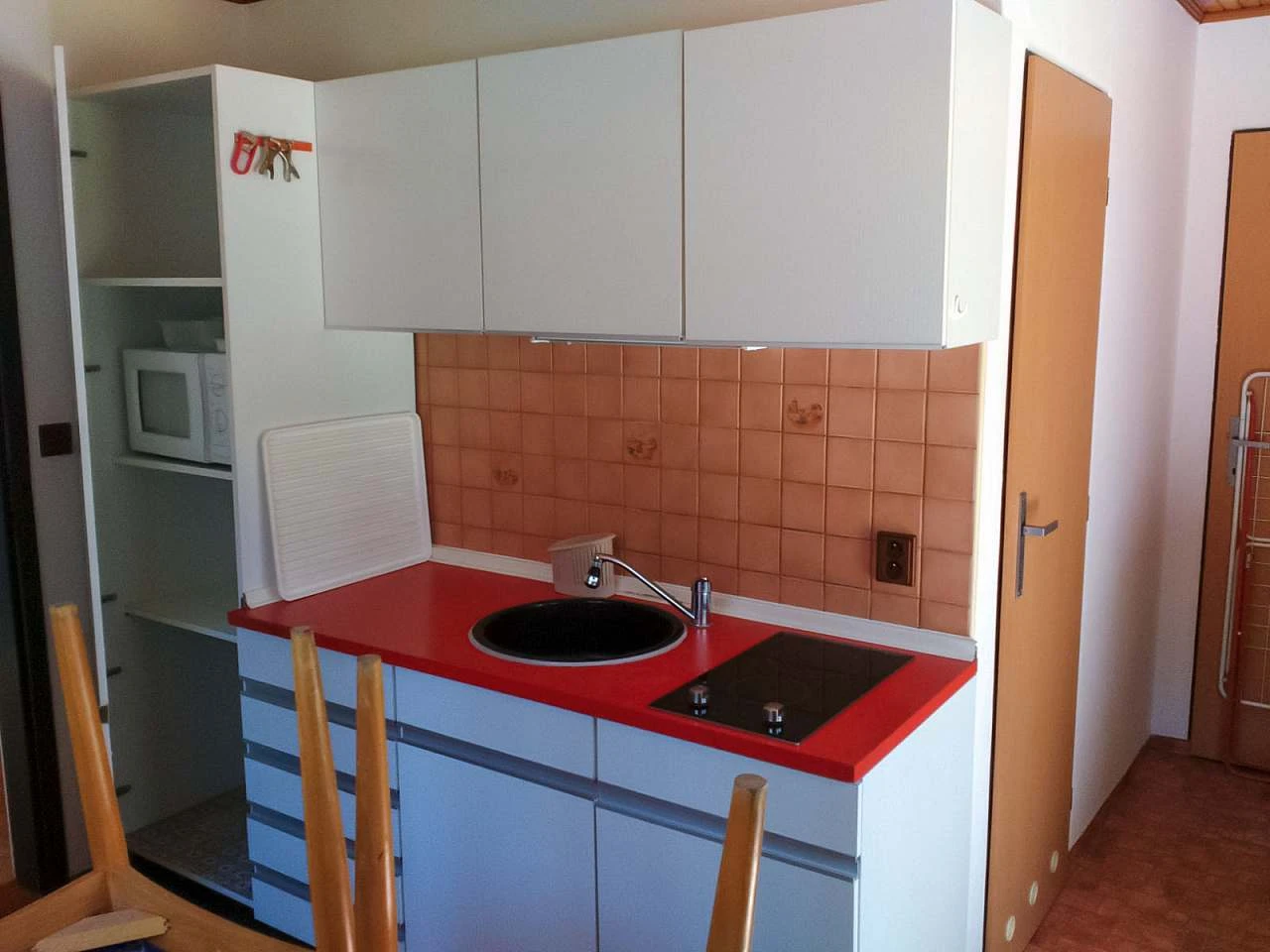 stůl, varná konvice, MW trouba, TV.