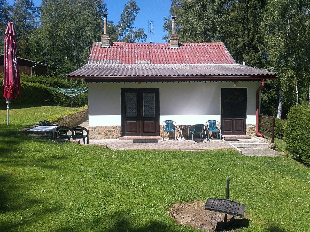 Každá polovina dvojchaty má TV, ohniště na grilování - žulový kámen. Společná garáž na kola.