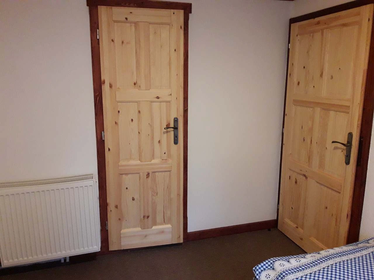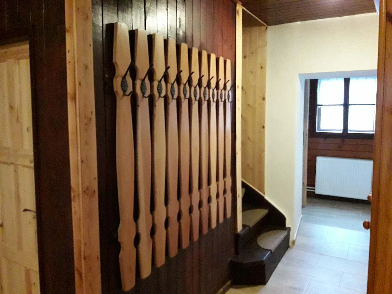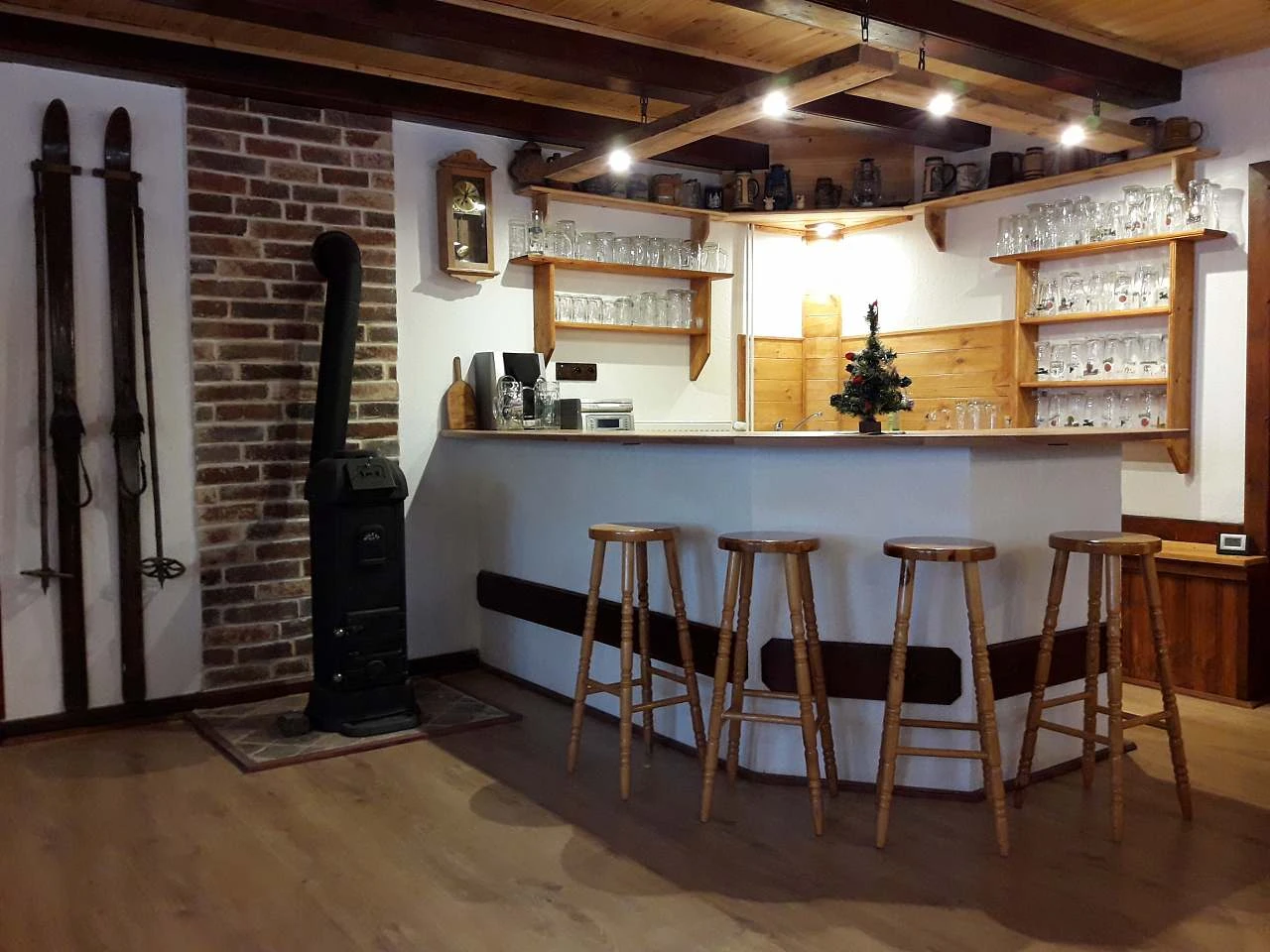 Interiér chaty je prostorný a dobře vybavený. V přízemí se nachází společenská místnost s barem a kapacitou pro 30 osob, což je ideální místo pro setkání s přáteli. K dispozici je také plně vybavená kuchyň, která zahrnuje moderní spotřebiče, jako je elektrická trouba, mikrovlnná trouba a myčka. Ložnice jsou rozděleny do různých typů, přičemž většina z nich má vlastní sociální zařízení, což zajišťuje pohodlí a soukromí.