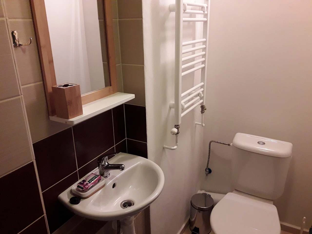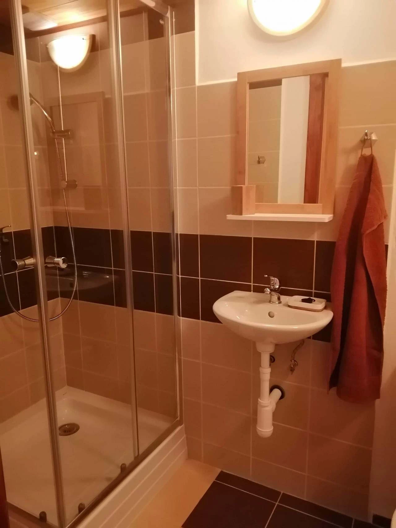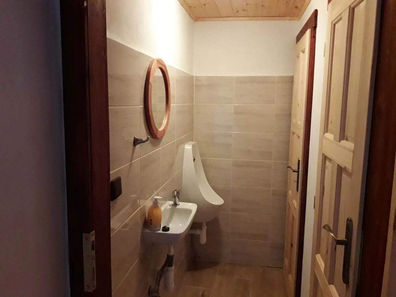 V koupelnách na pokojích je sprchový kout, umyvadlo a WC. V přízemí oddělené WC pánské a dámské.