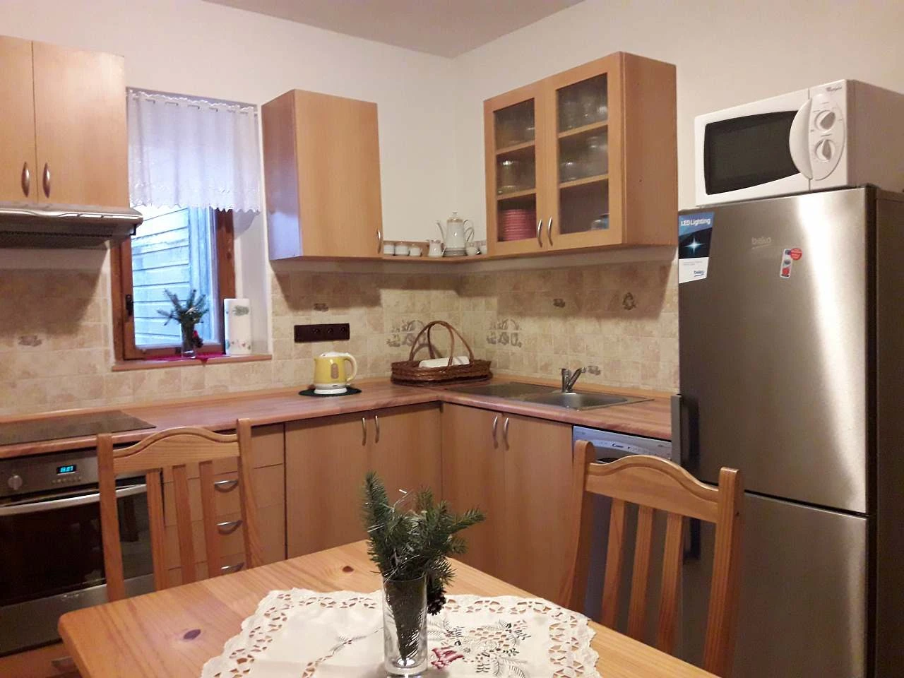 Vybavená kuchyň, el. trouba s varnou deskou, mikrovlnná trouba, chladnička s mrazničkou, digestoř, myčka, rychlovarná konvice, toustovač,