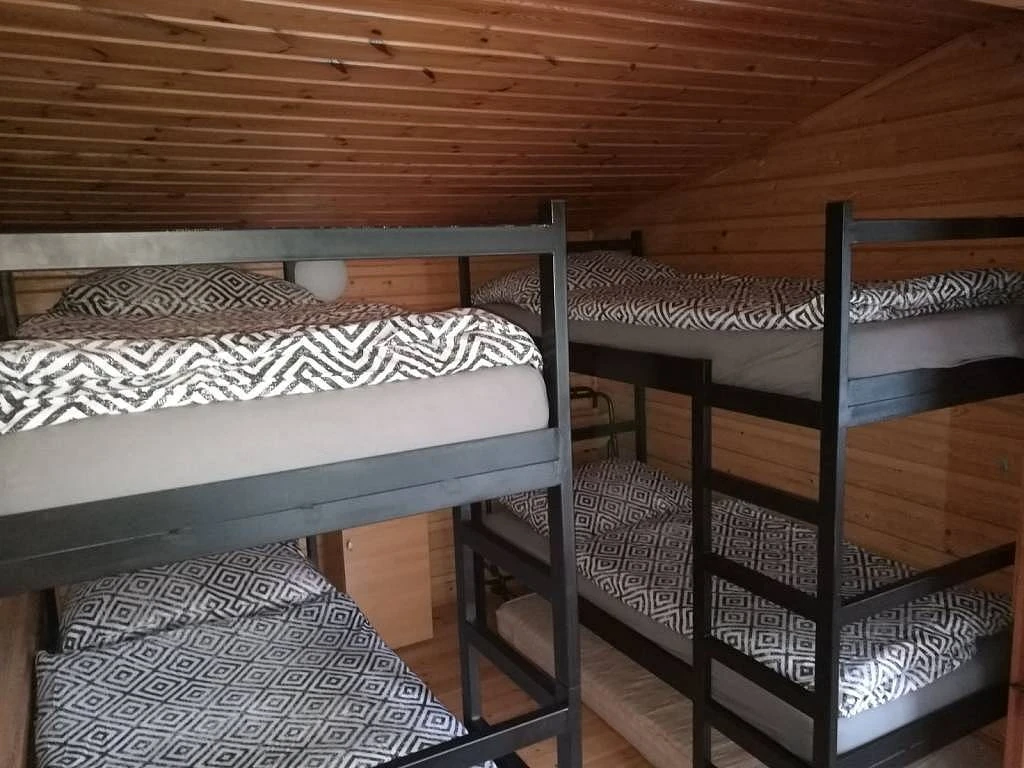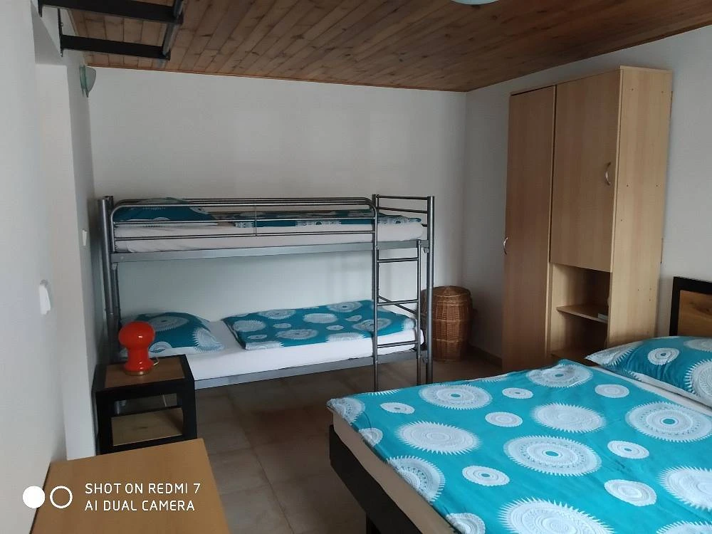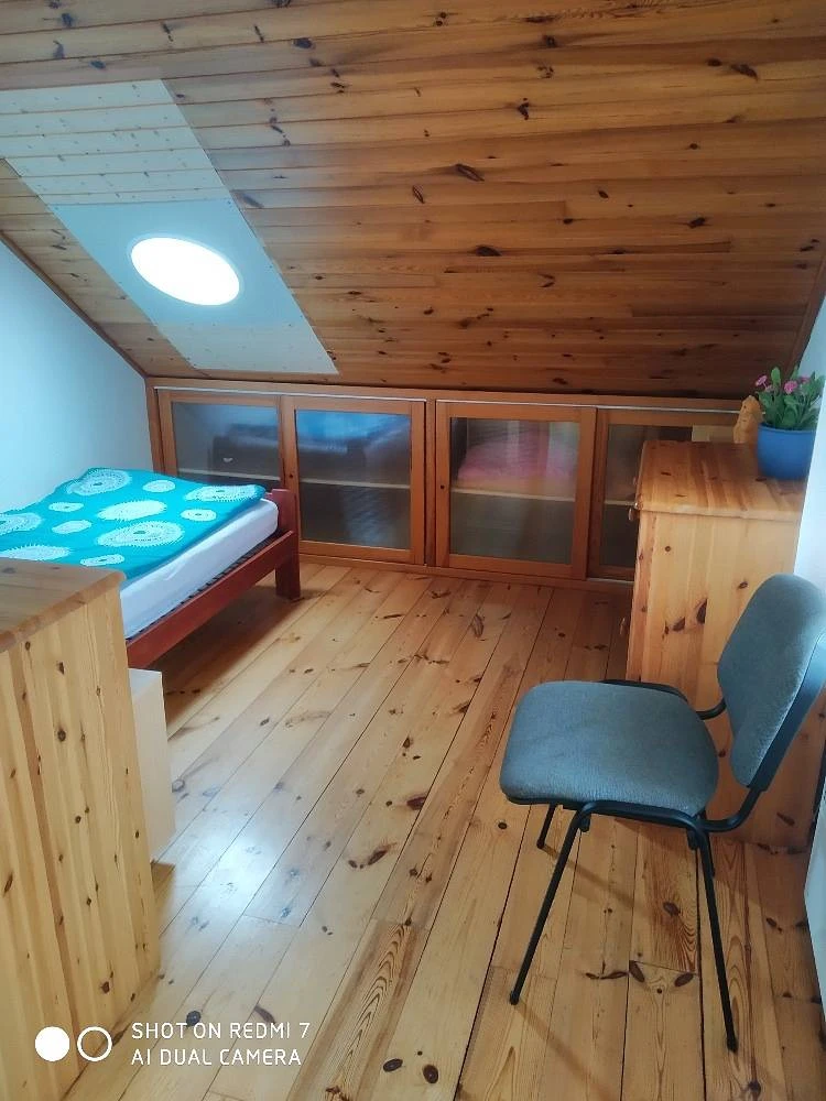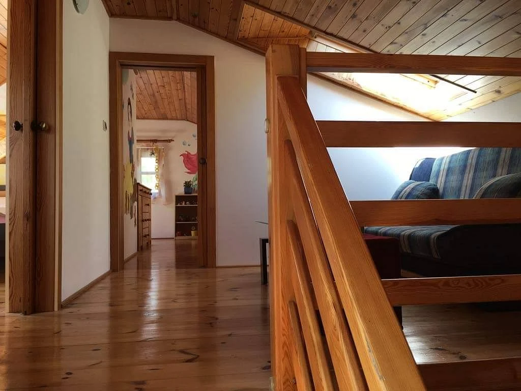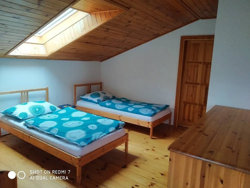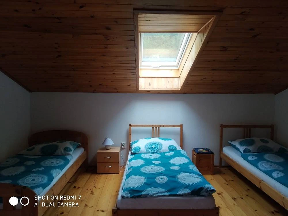 V patře se nachází 3 ložnice: 1x 2-lůžkový pokoj s manželskou postelí, 1x 4-lůžkový pokoj s oddělenými postelemi a 1x 4-lůžkový pokoj s manželskou postelí a dvěma dvoupatrovými postelemi.